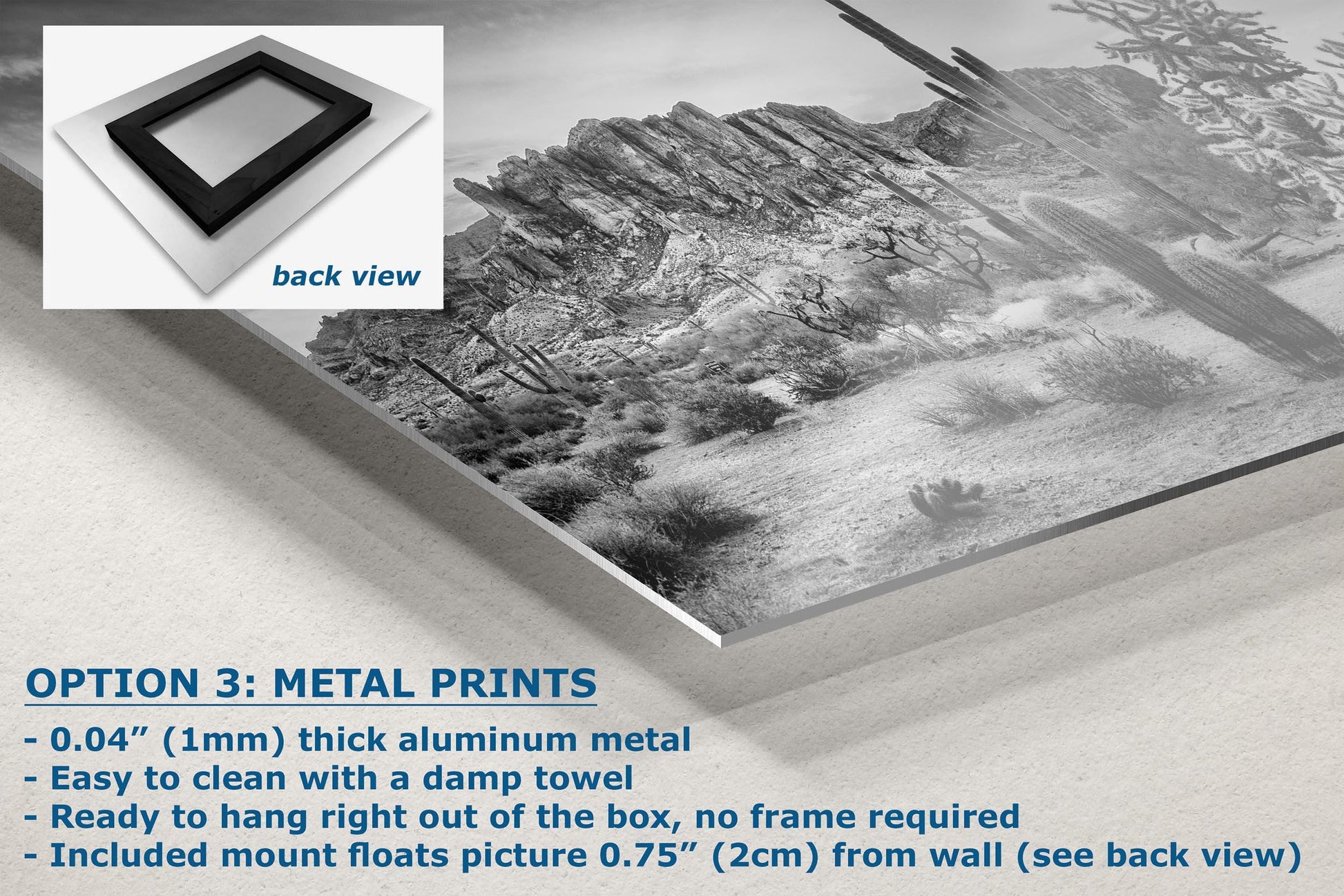 - Floating metal art: 0.04" (1mm) thick specialty coated aluminum metal includes a mount that floats the picture 0.75" (2cm) from your wall