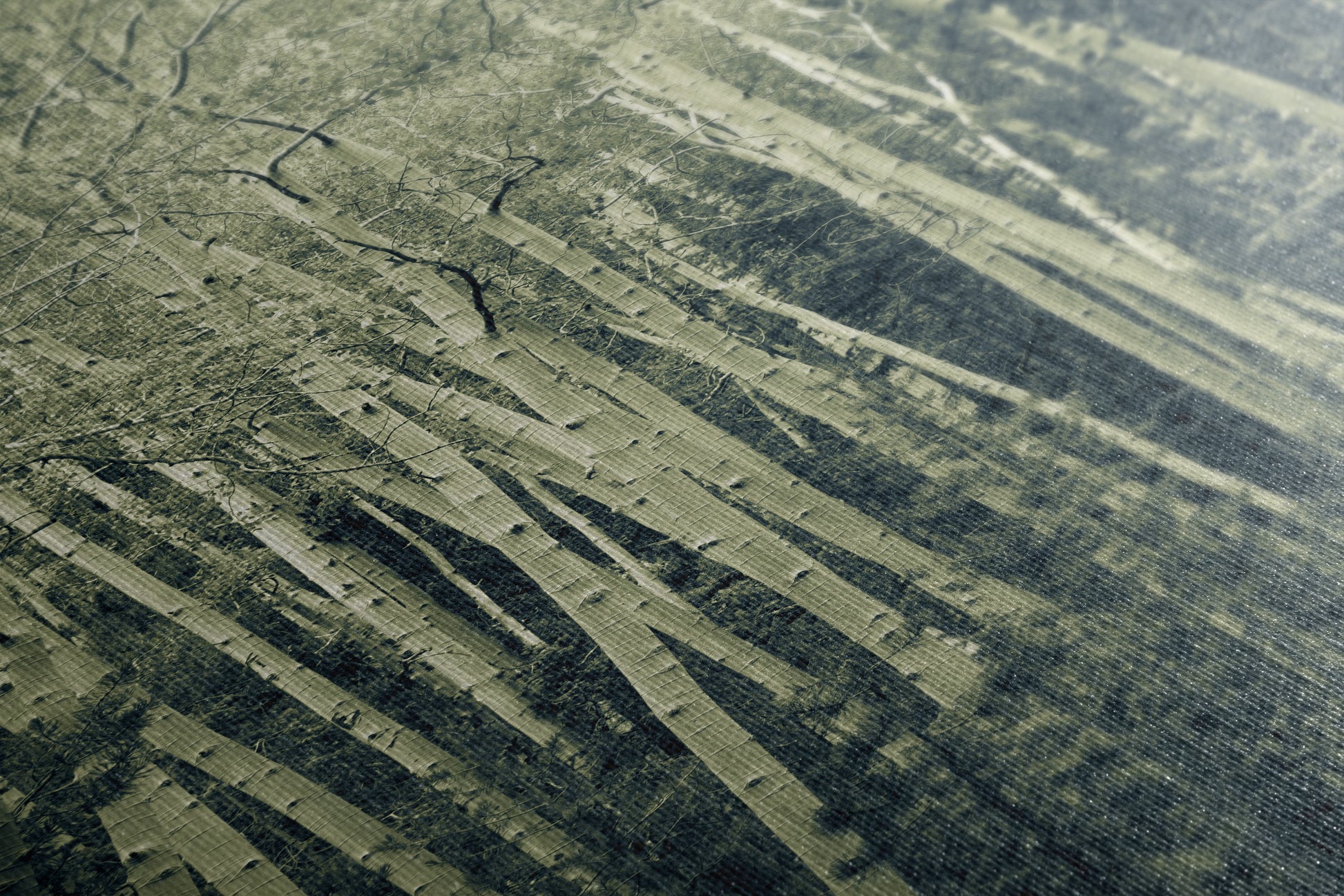 This forest bathing relaxation artwork captures the enchanting beauty of a duotone forest scene, where the white bark of the aspens contrasts beautifully with the lush green backdrop.