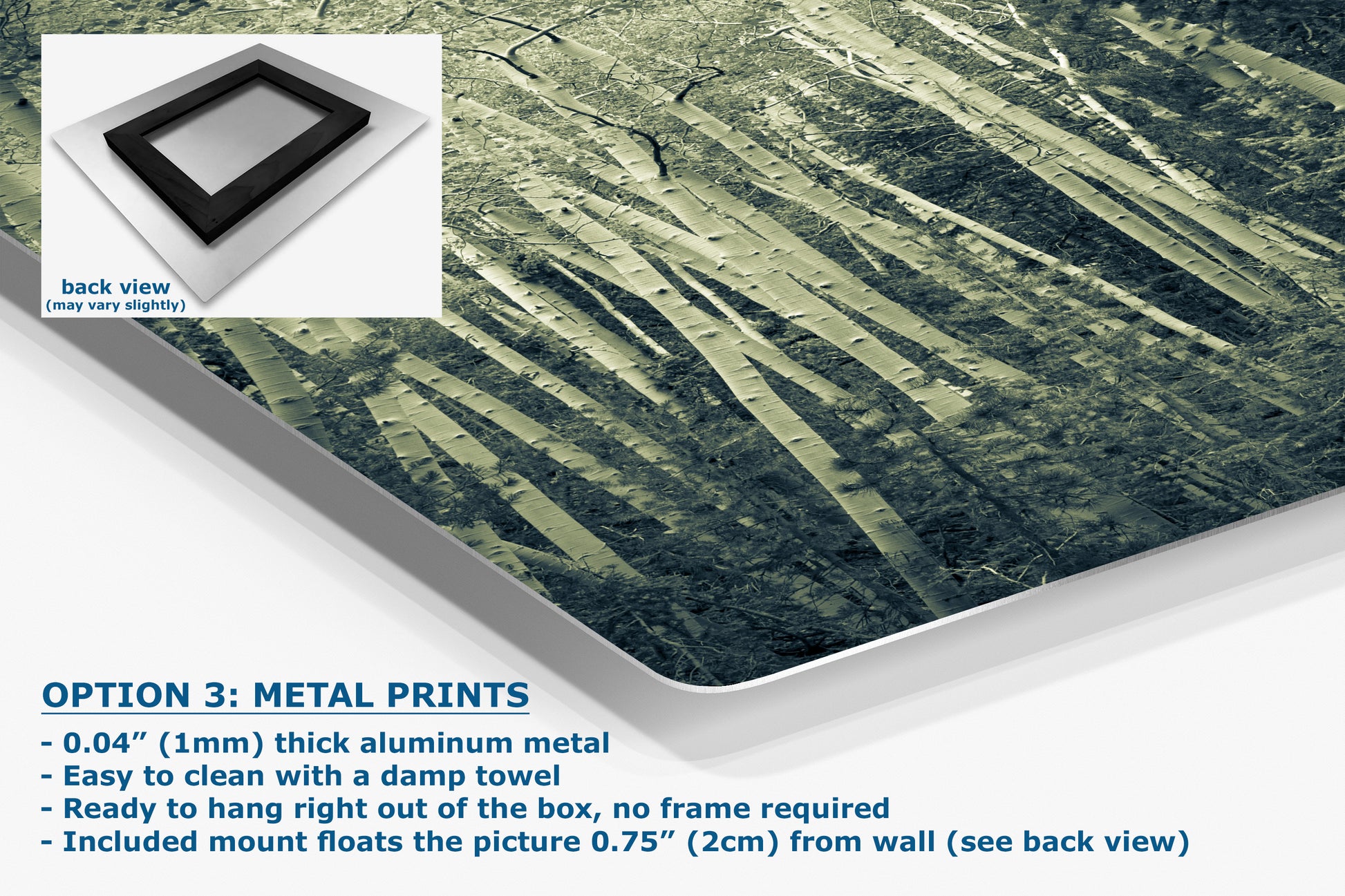 - Floating metal art: 0.04" (1mm) thick specialty coated aluminum metal includes a mount that floats the picture 0.75" (2cm) from your wall