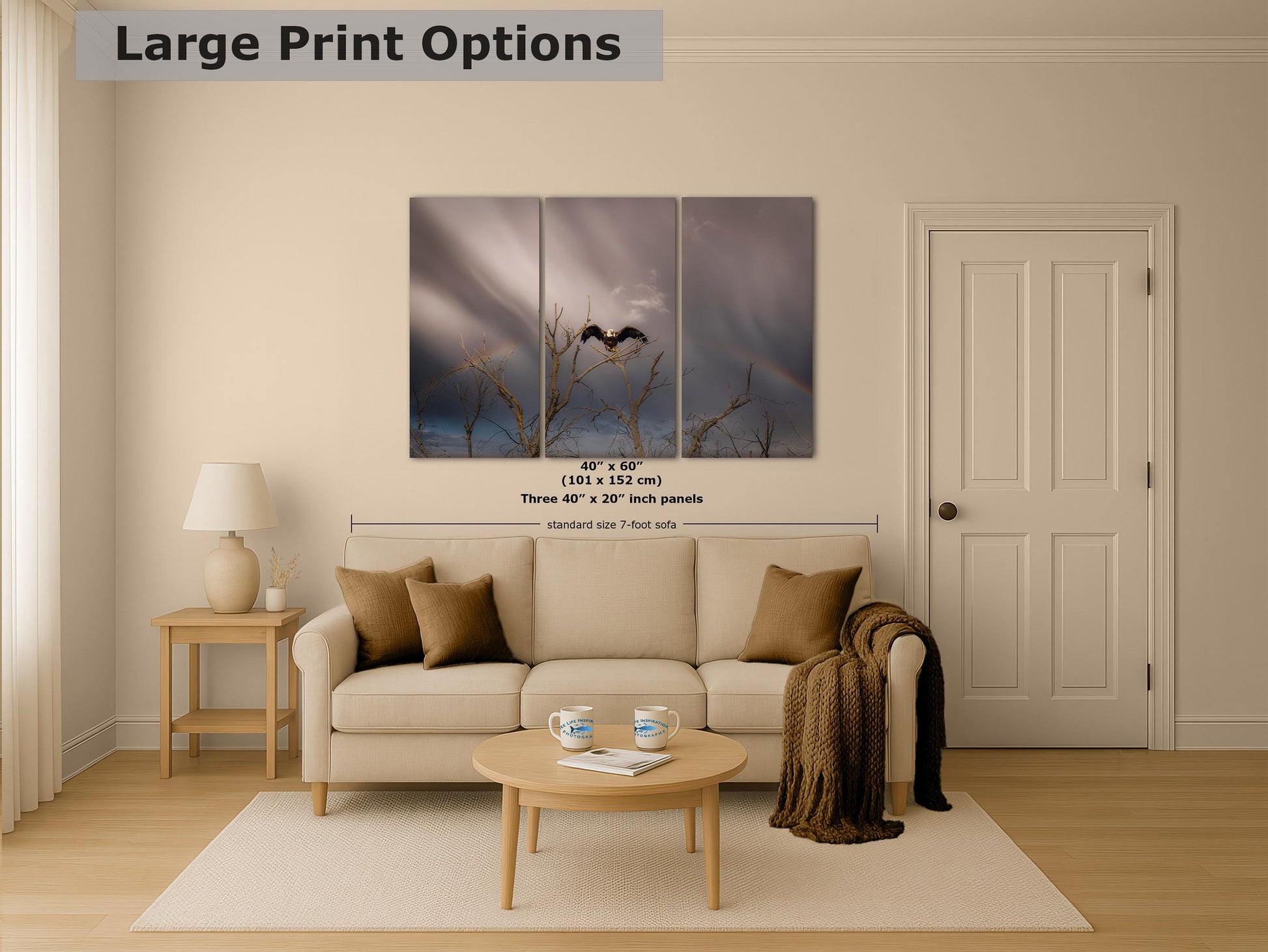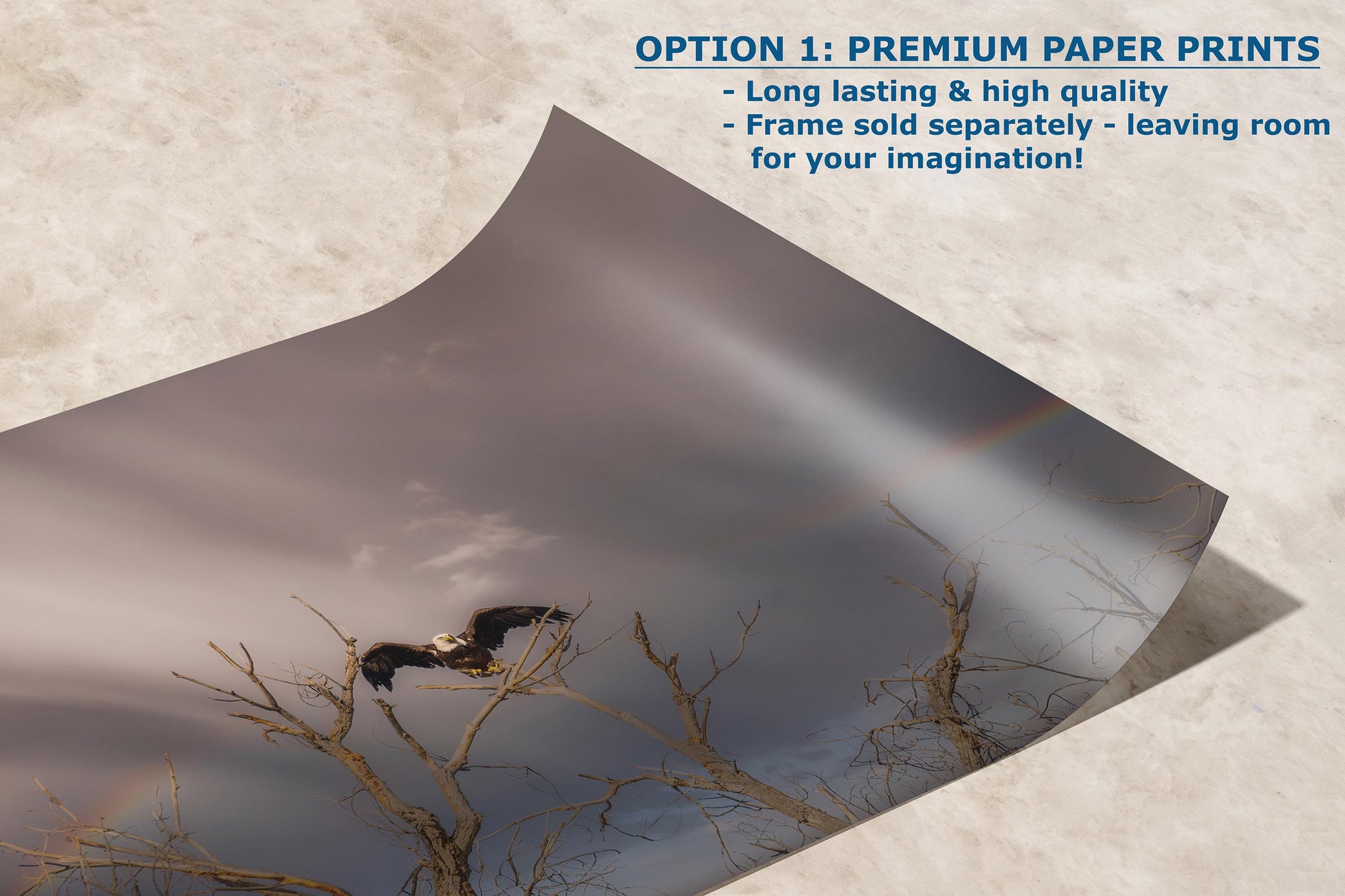 - Professionally printed wildlife photography of a soaring bald eagle