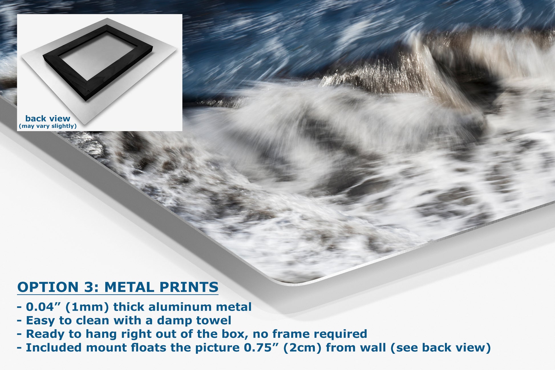 - Floating metal art: 0.04" (1mm) thick specialty coated aluminum metal includes a mount that floats the picture 0.75" (2cm) from your wall