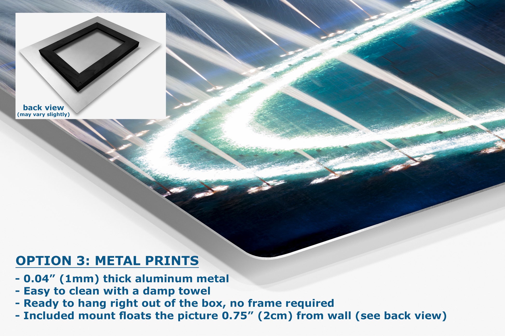 - Floating metal art: 0.04" (1mm) thick specialty coated aluminum metal includes a mount that floats the picture 0.75" (2cm) from your wall