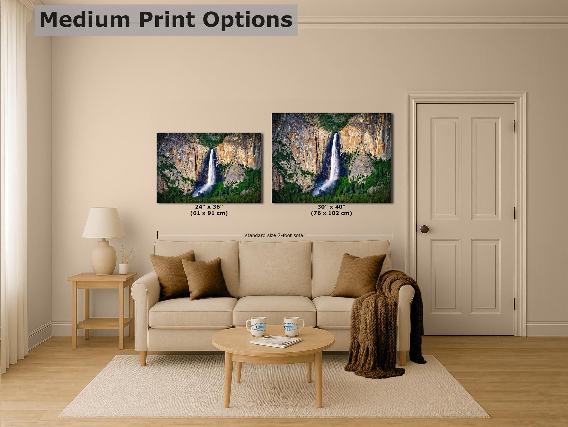 Captured from the iconic Tunnel View overlook, this waterfall picture showcases the majestic Bridalveil Falls and cascading down towering granite mountains surrounded by lush green forests. Perfect for creating a calming atmosphere, this relaxation artwork is ideal for meditation areas, dorm rooms, offices, or any wall needing a touch of natural serenity.