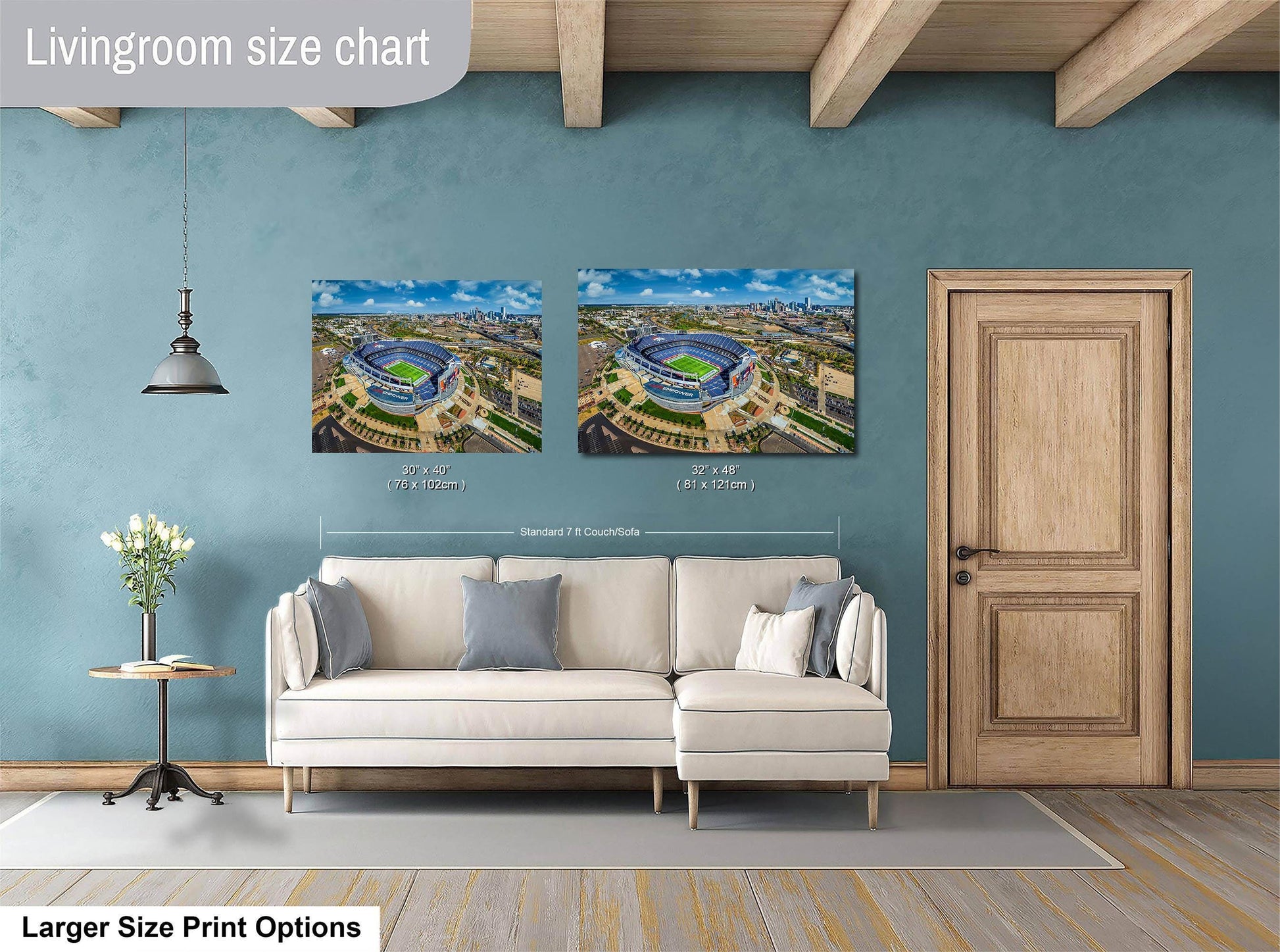 Of course you do! This striking photographic art print captures an aerial view of Mile High Stadium in Denver, Colorado, home to the legendary Broncos. With a perfect view of the field, city skyline, and expansive blue skies, this piece brings the excitement and pride of Broncos football straight to your walls.