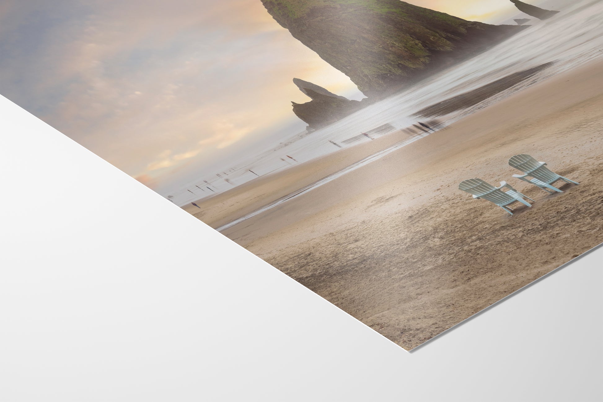 - Features Haystack Rock with surrounding waves and soft sky hues