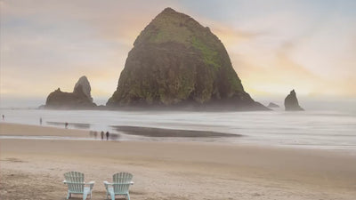 Capturing the iconic Haystack Rock amid the gentle waves and soft, pastel sky, this Pacific Northwest beach photo evokes the soothing sounds of the ocean and the refreshing sea breeze.