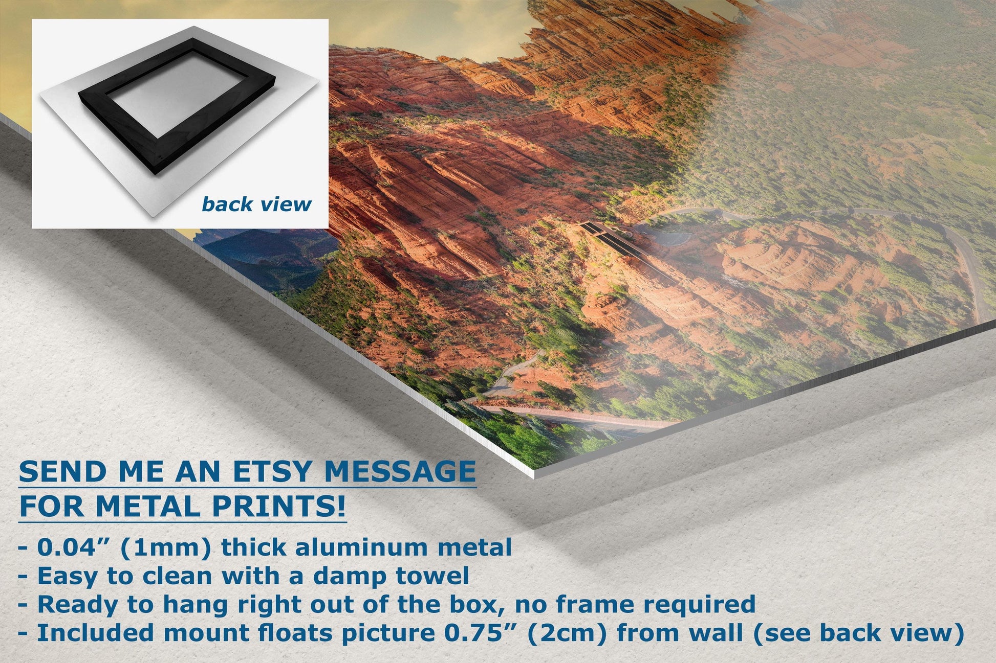 - Floating metal art: 0.04" (1mm) thick specialty coated aluminum metal includes a mount that floats the picture 0.75" (2cm) from your wall