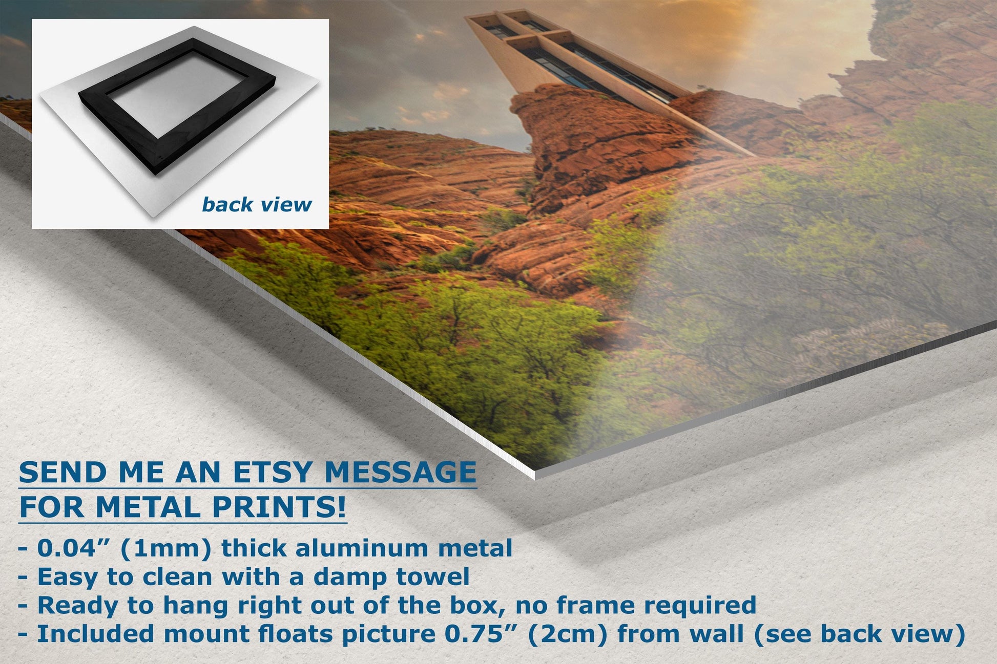 - Floating metal art: 0.04" (1mm) thick specialty coated aluminum metal includes a mount that floats the picture 0.75" (2cm) from your wall
