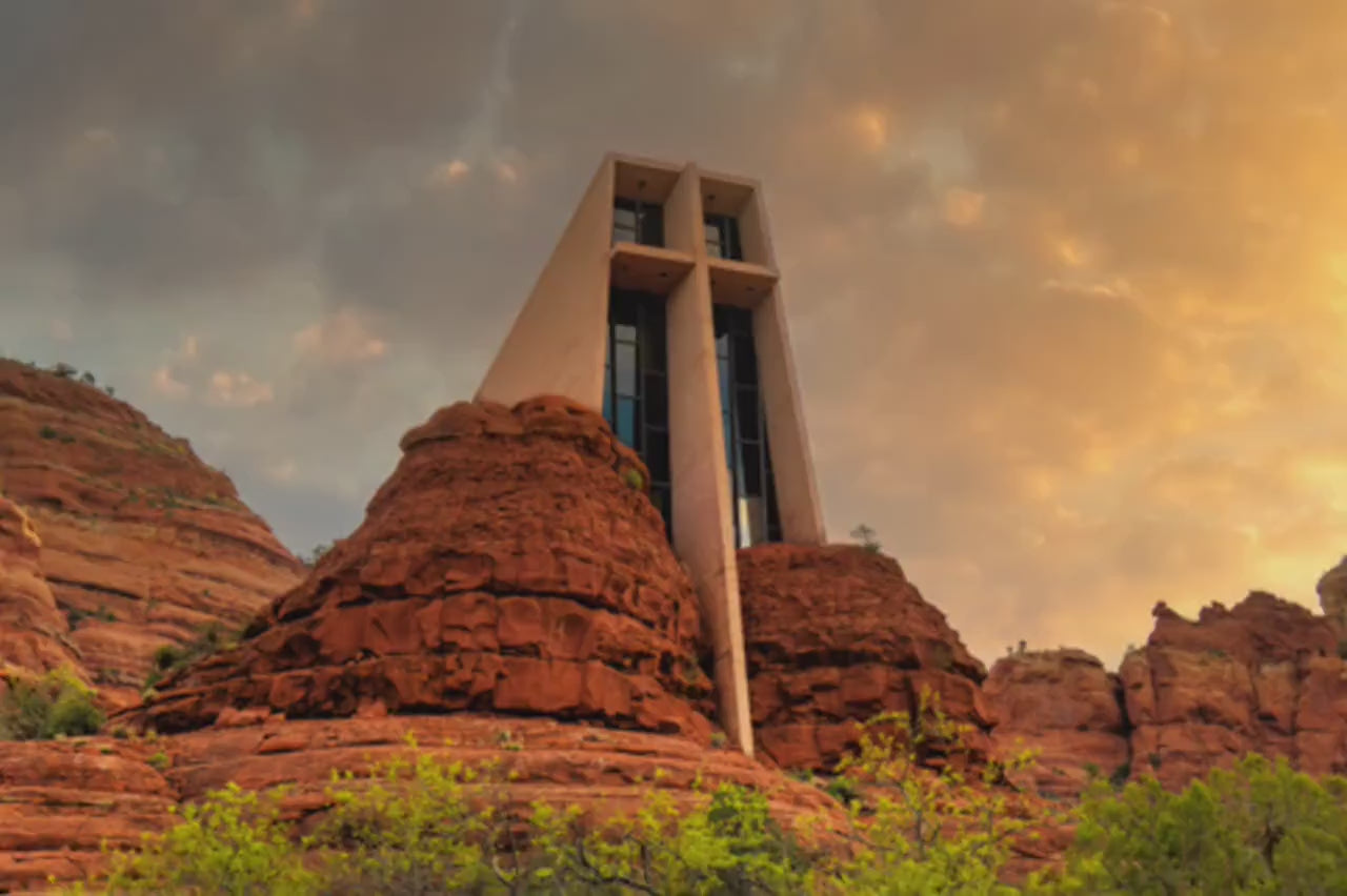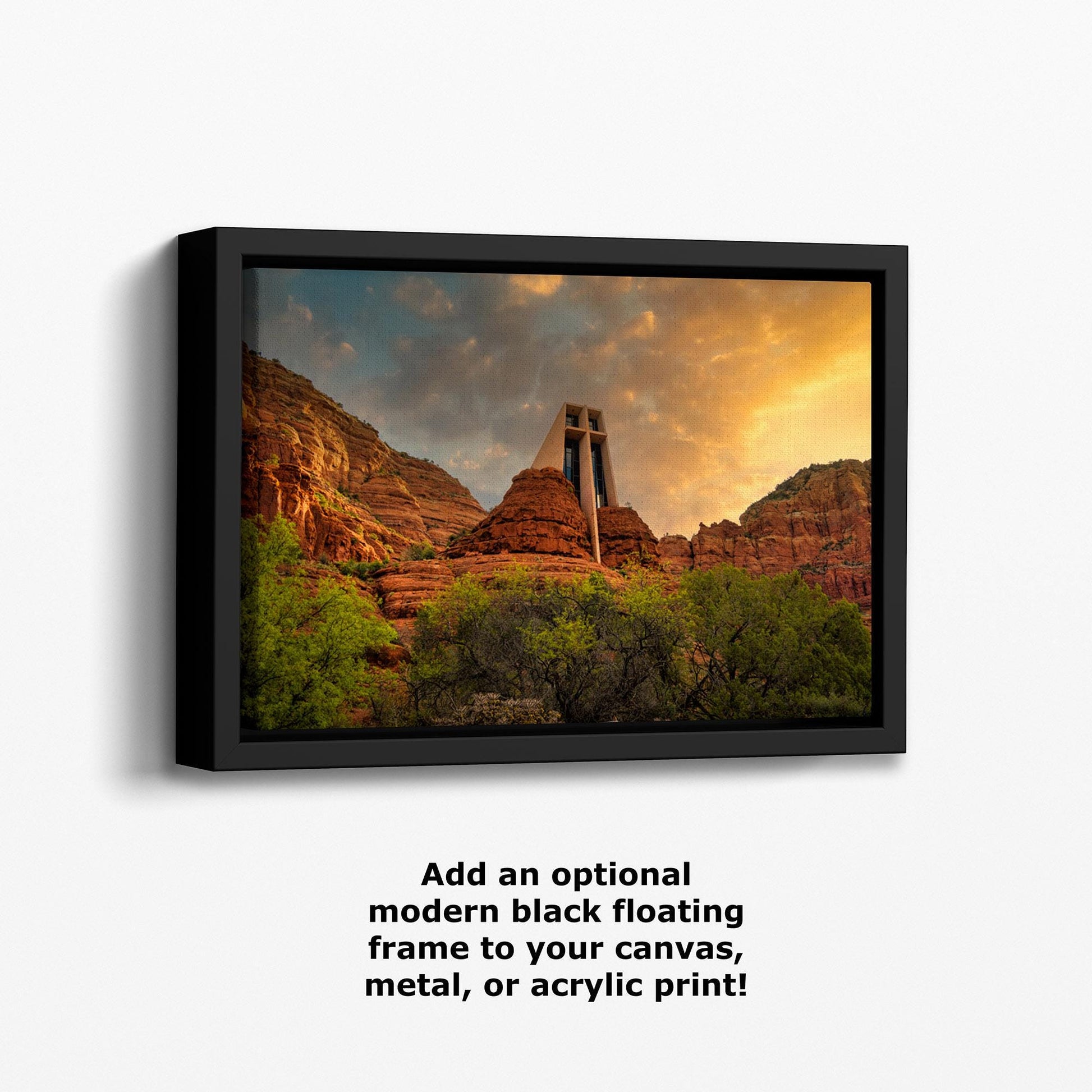 This Southwestern wall art beautifully showcases the chapel nestled among vibrant red rocks and lush greenery, illuminated by the warm glow of a setting sun. Perfect for adding a touch of serenity and awe to your home, office, or workspace, this church landscape print transforms any space into a peaceful retreat.
