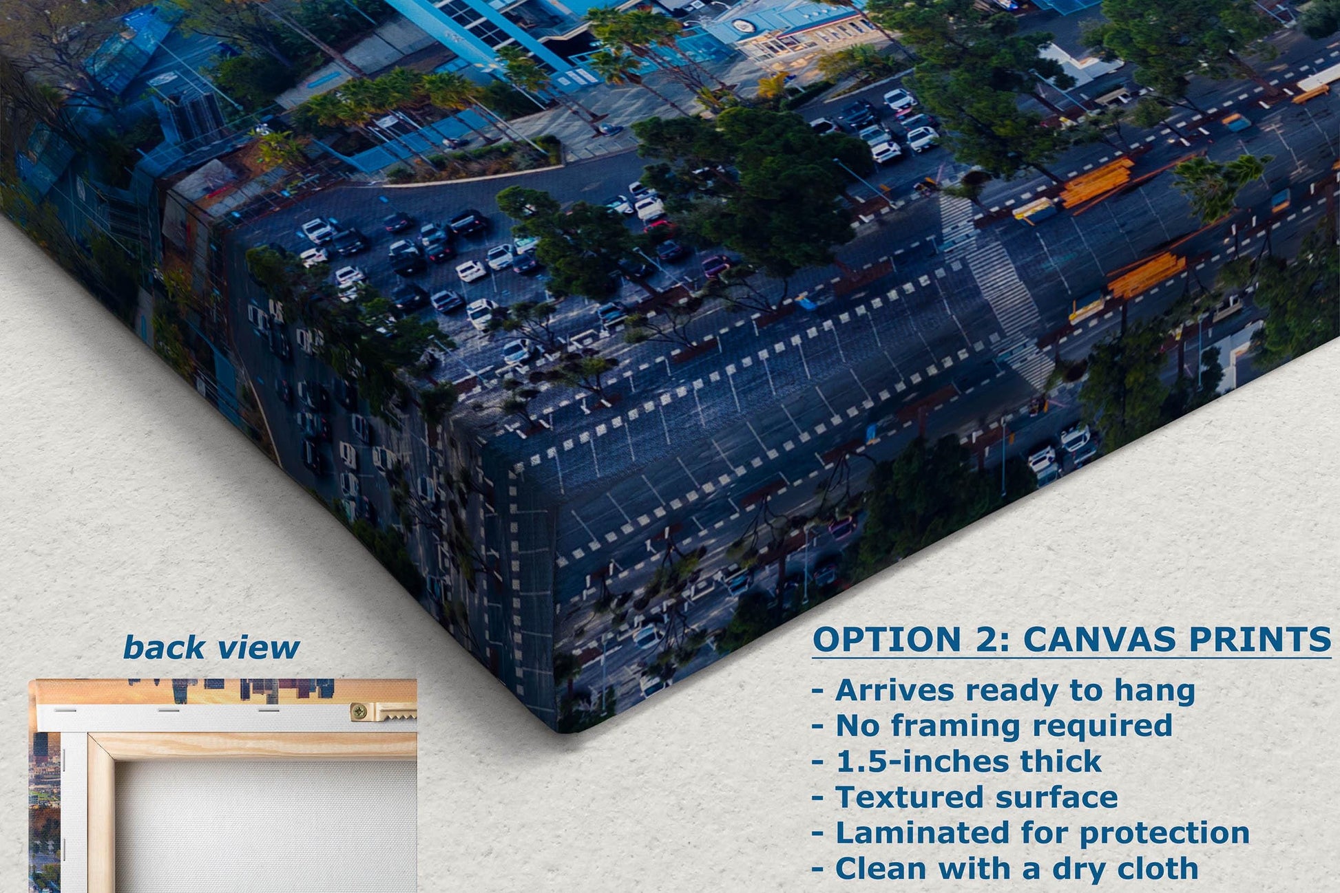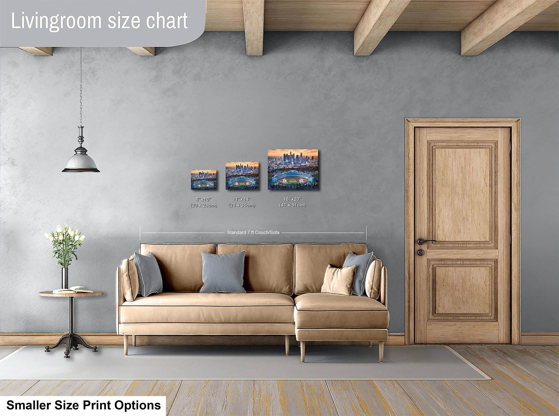 This breathtaking canvas print offers a spectacular aerial view of the Los Angeles Dodgers Stadium, set against the sprawling backdrop of the LA skyline at sunset. The stadium lights up in anticipation of a game, while the city behind it basks in the golden hues of the setting sun, creating a scene that's both electrifying and majestic.