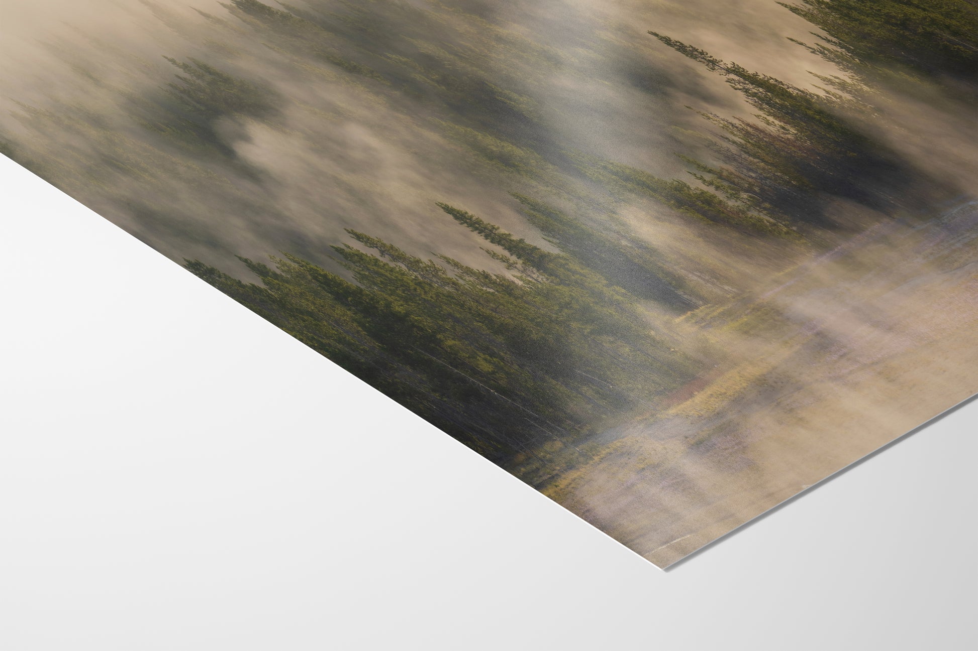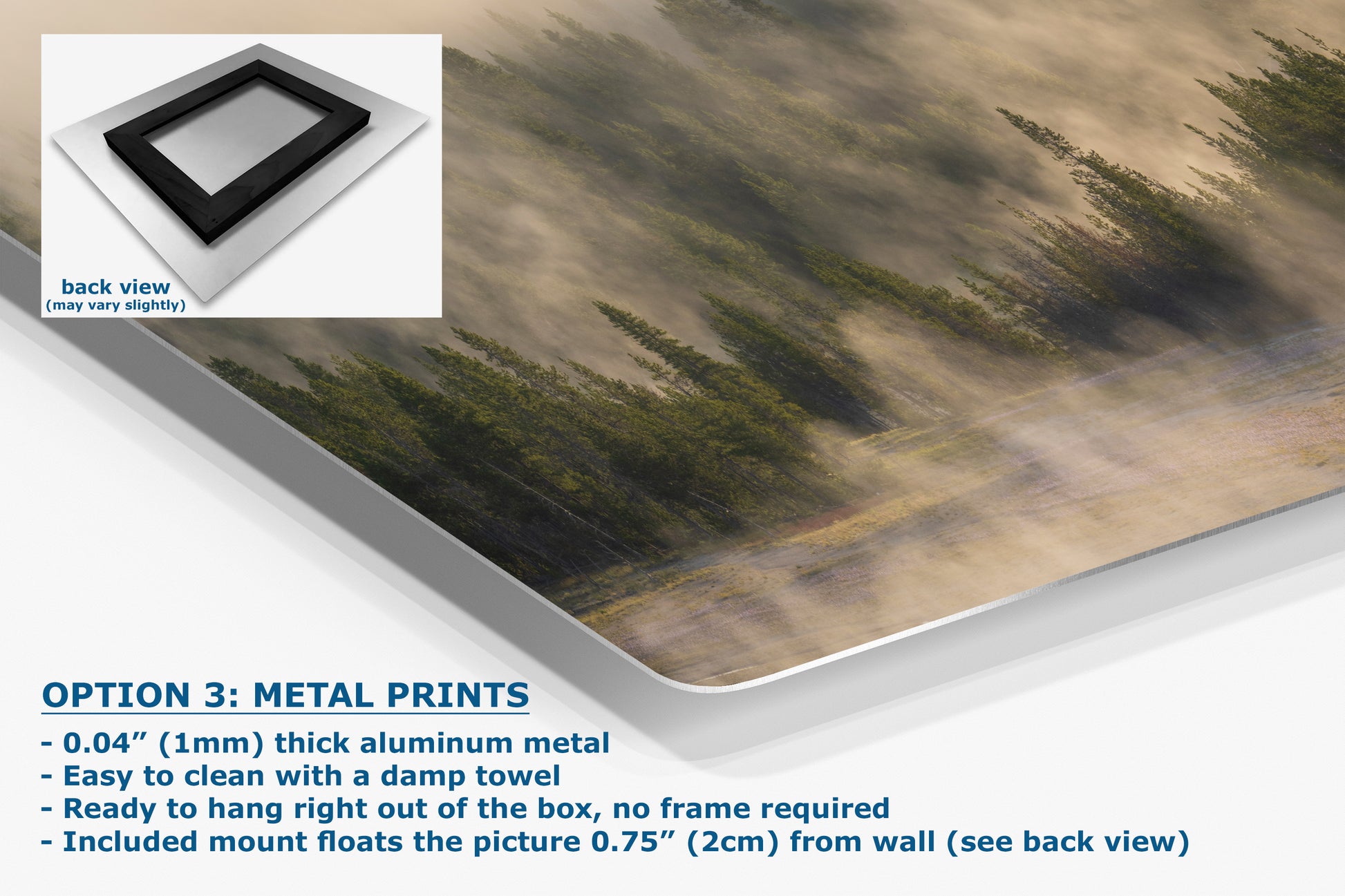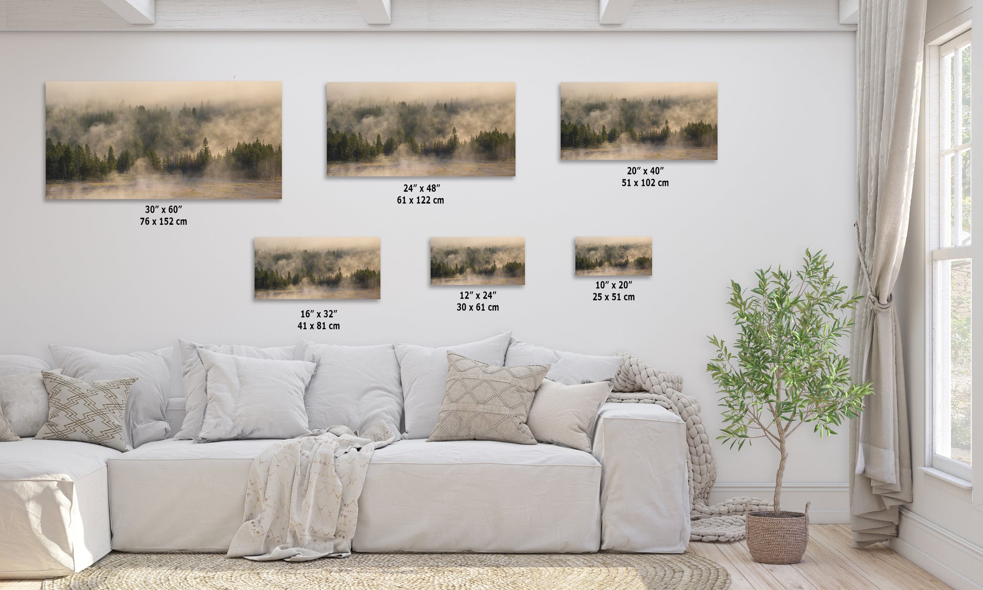 Perfect for lovers of forest bathing, outdoor adventures, or the steamy Yellowstone landscape, this captivating wall art captures the mysterious allure of mist-shrouded trees emerging through the ethereal steam of Yellowstone.