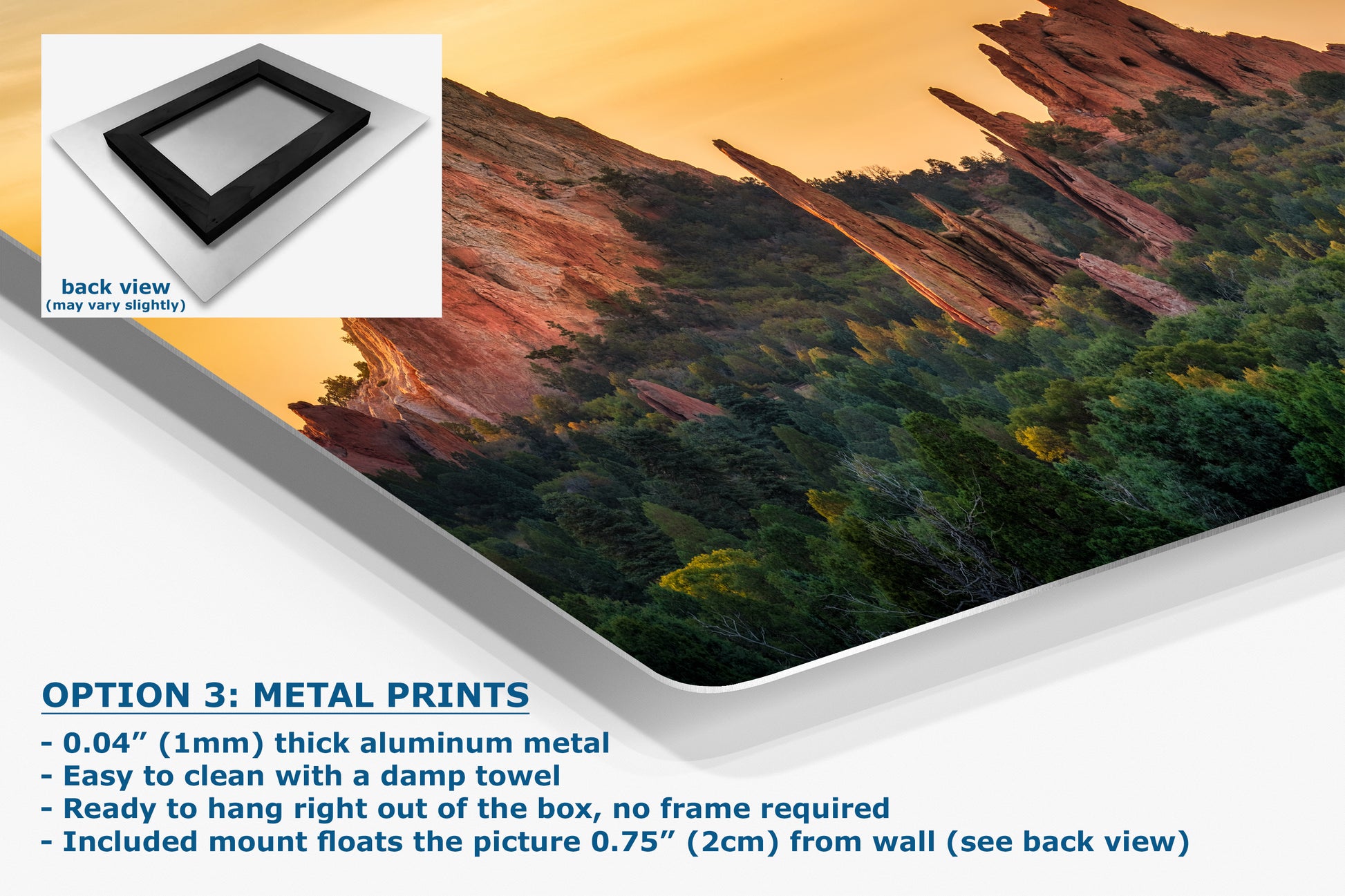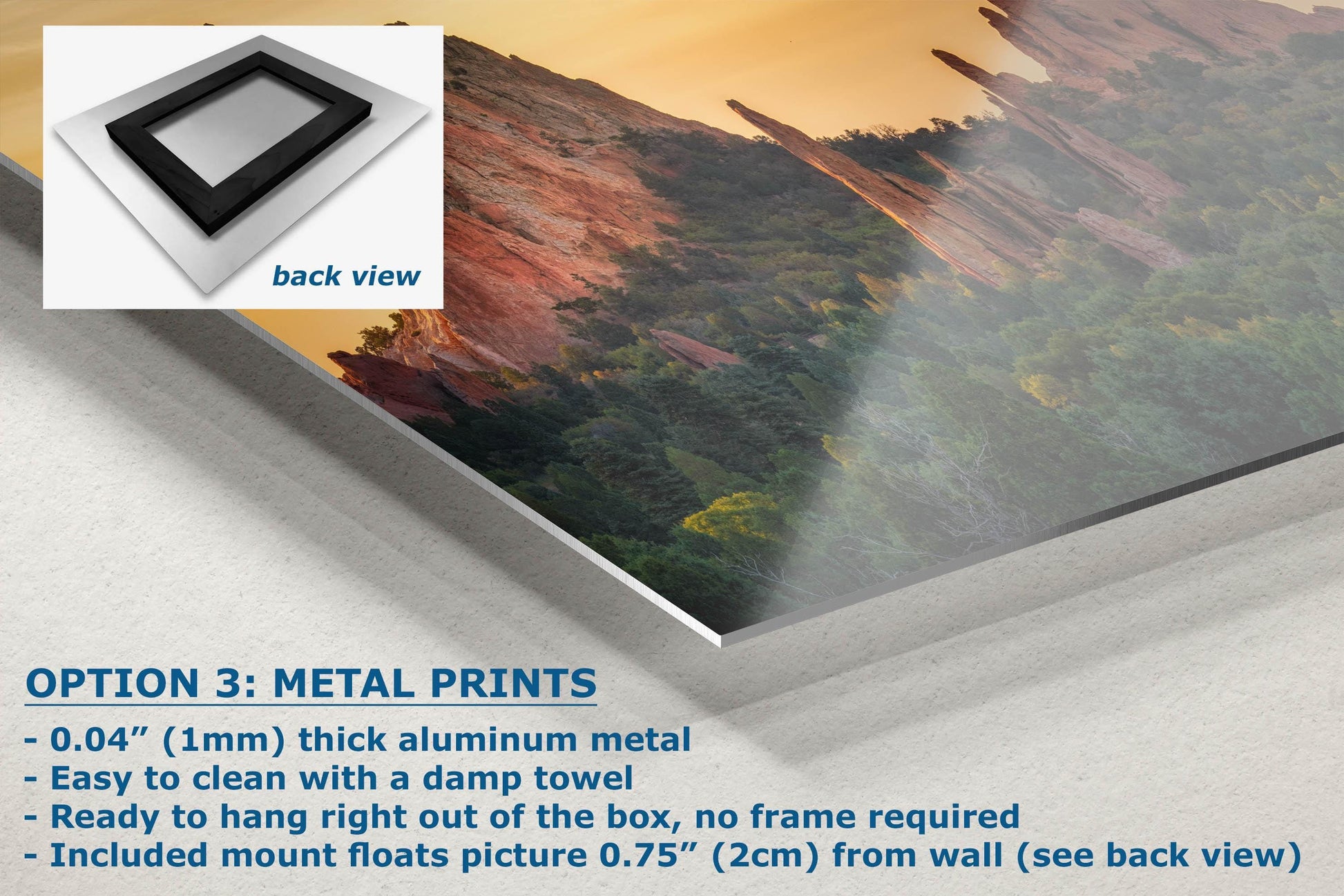 - Floating metal art: 0.04" (1mm) thick specialty coated aluminum metal includes a mount that floats the picture 0.75" (2cm) from your wall