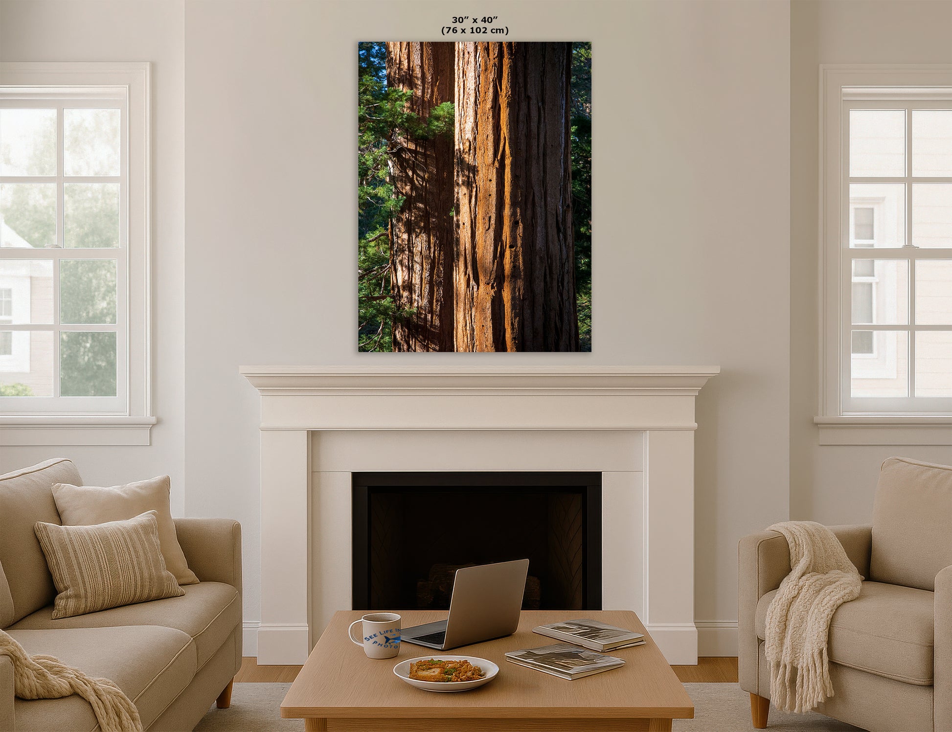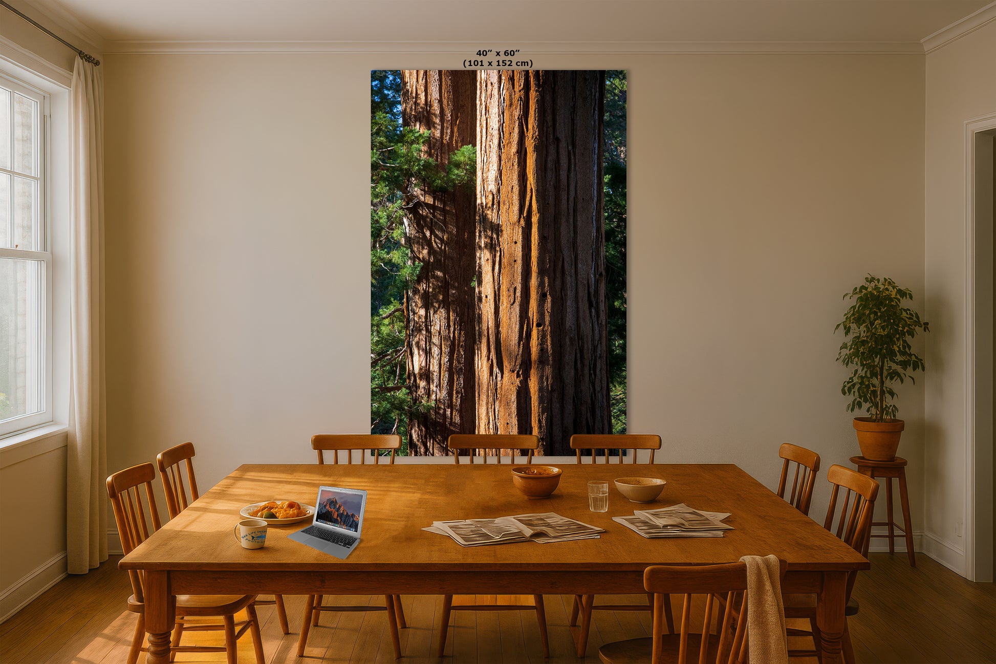 Capturing two towering redwood trees standing strong and proud in a serene Sequoia Grove, this wall art perfectly showcases the awe-inspiring beauty of the forest during sunrise.