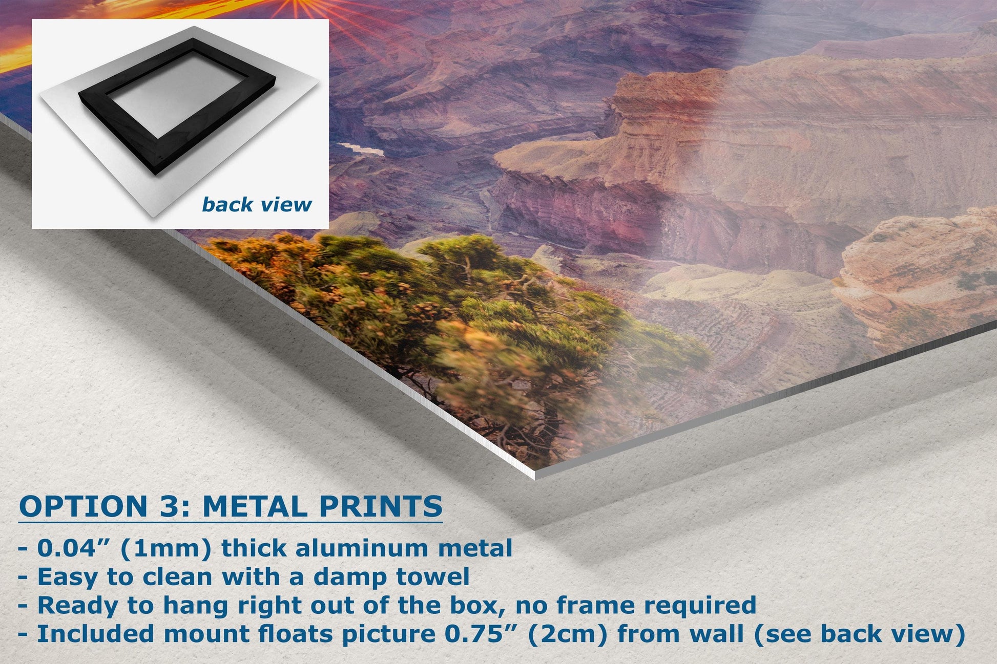 - Floating metal art: 0.04" (1mm) thick specialty coated aluminum metal includes a mount that floats the picture 0.75" (2cm) from your wall