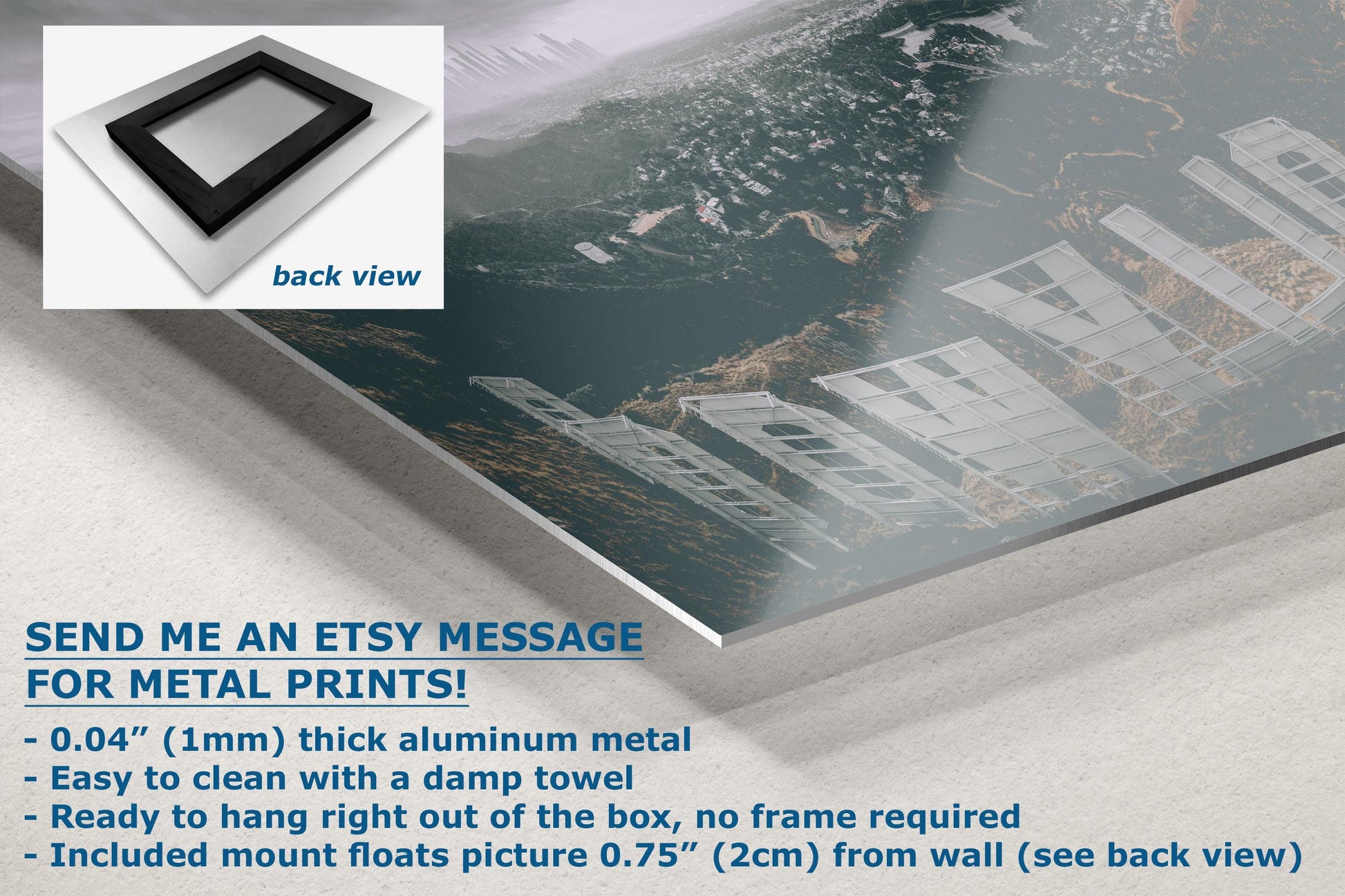 - Floating metal art: 0.04" (1mm) thick specialty coated aluminum metal includes a mount that floats the picture 0.75" (2cm) from your wall