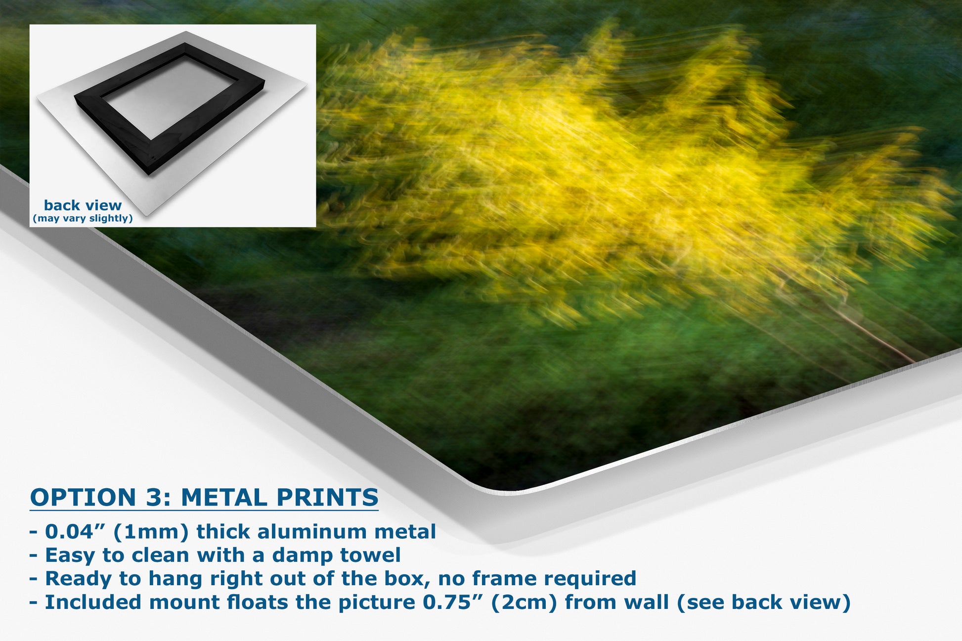 - Floating metal art: 0.04" (1mm) thick specialty coated aluminum metal includes a mount that floats the picture 0.75" (2cm) from your wall