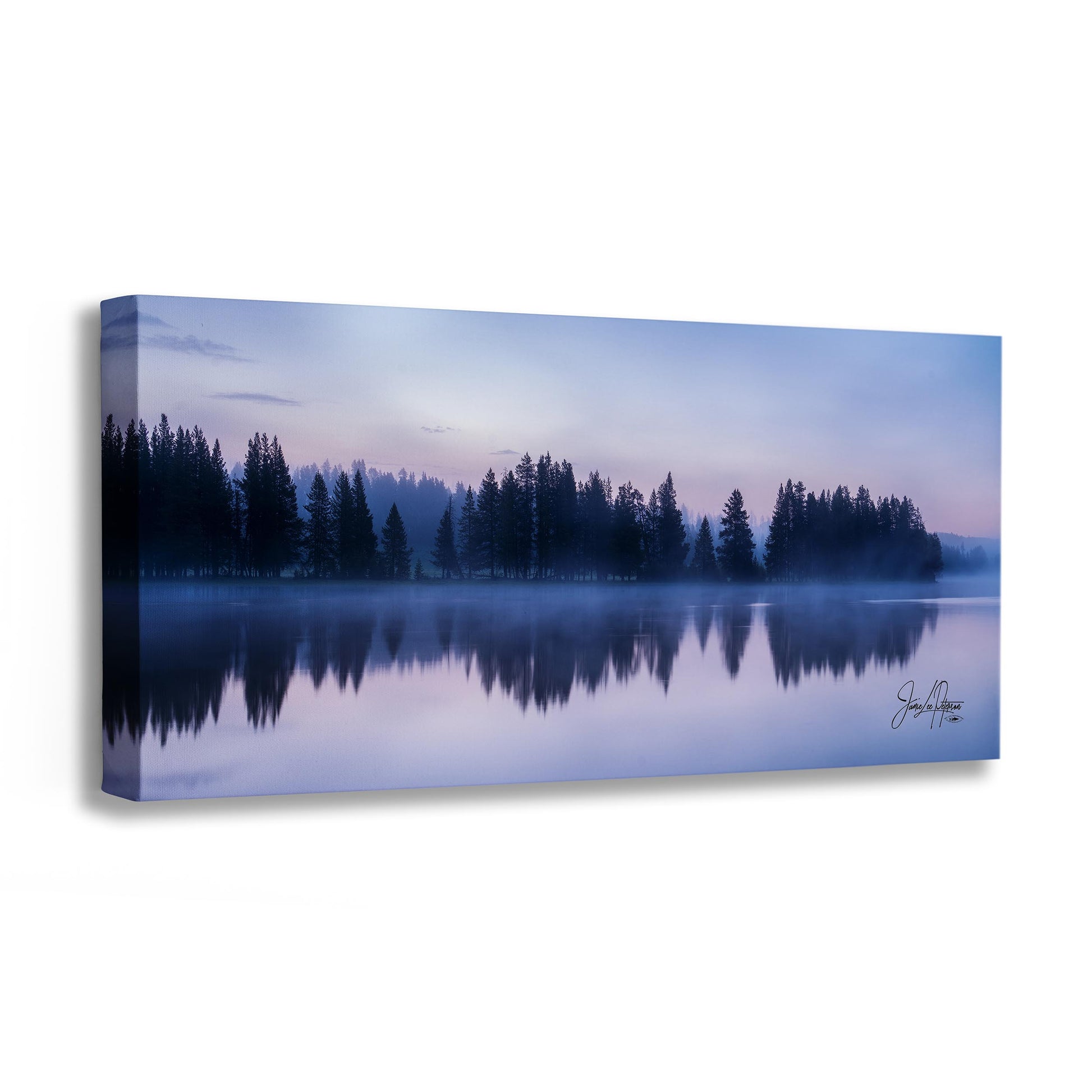 This high-quality art print captures the peaceful reflection of a foggy forest at dawn, where the early morning light softly filters through the mist over Yellowstone Lake. The serene scene evokes a sense of relaxation and mindfulness, making it an ideal piece for meditation, office decor, or home decorating.