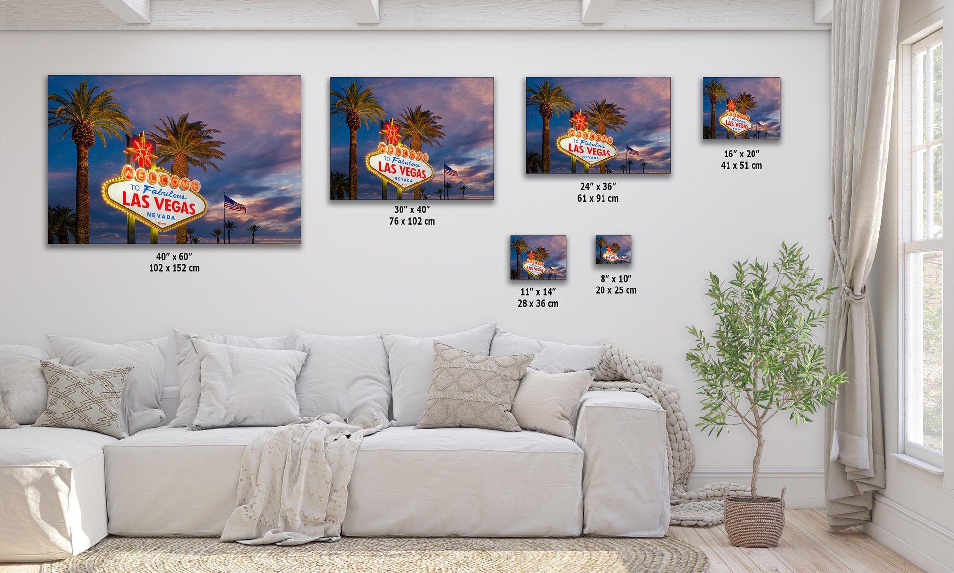 This captivating work of art features the iconic Welcome to Las Vegas Sign basking in a glorious sunrise. It's not just a photo; it’s an invitation to relive the thrill and glamour of Las Vegas every day.