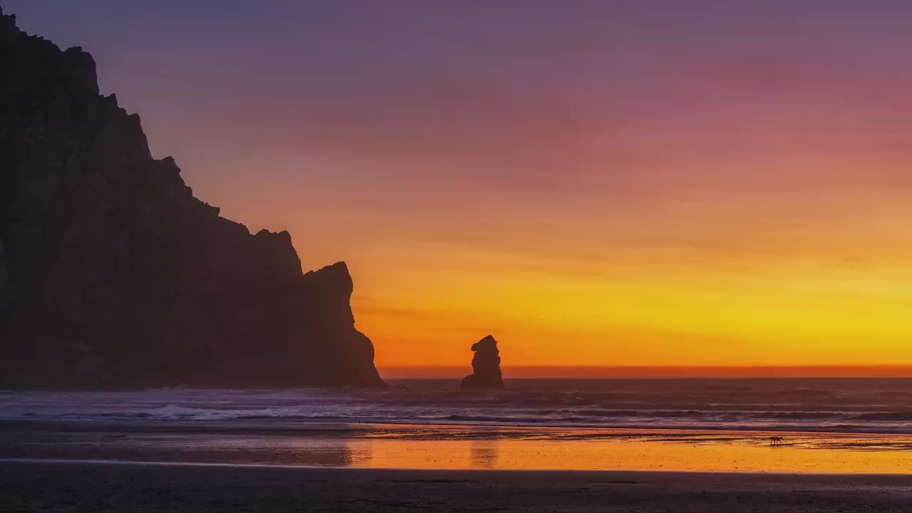 Perfect for adding a touch of nature's serenity to your dorm room, office, or home decor, this landscape artwork captures the breathtaking sunset over Morro Rock, where vibrant oranges and purples paint the sky in a peaceful display of nature's artistry. A crescent moon gently hangs in the twilight sky, adding a hint of magic and drama to this calming scene.