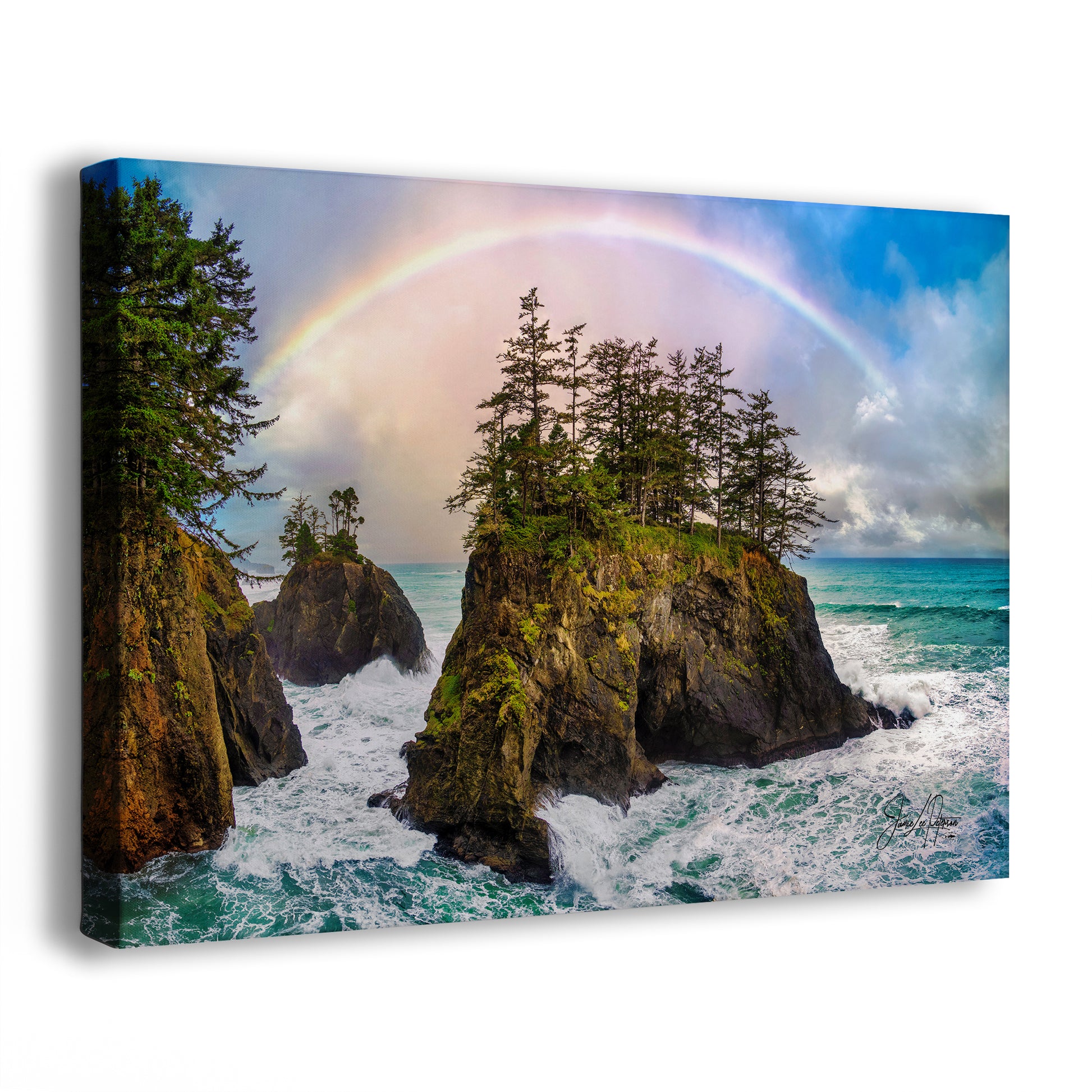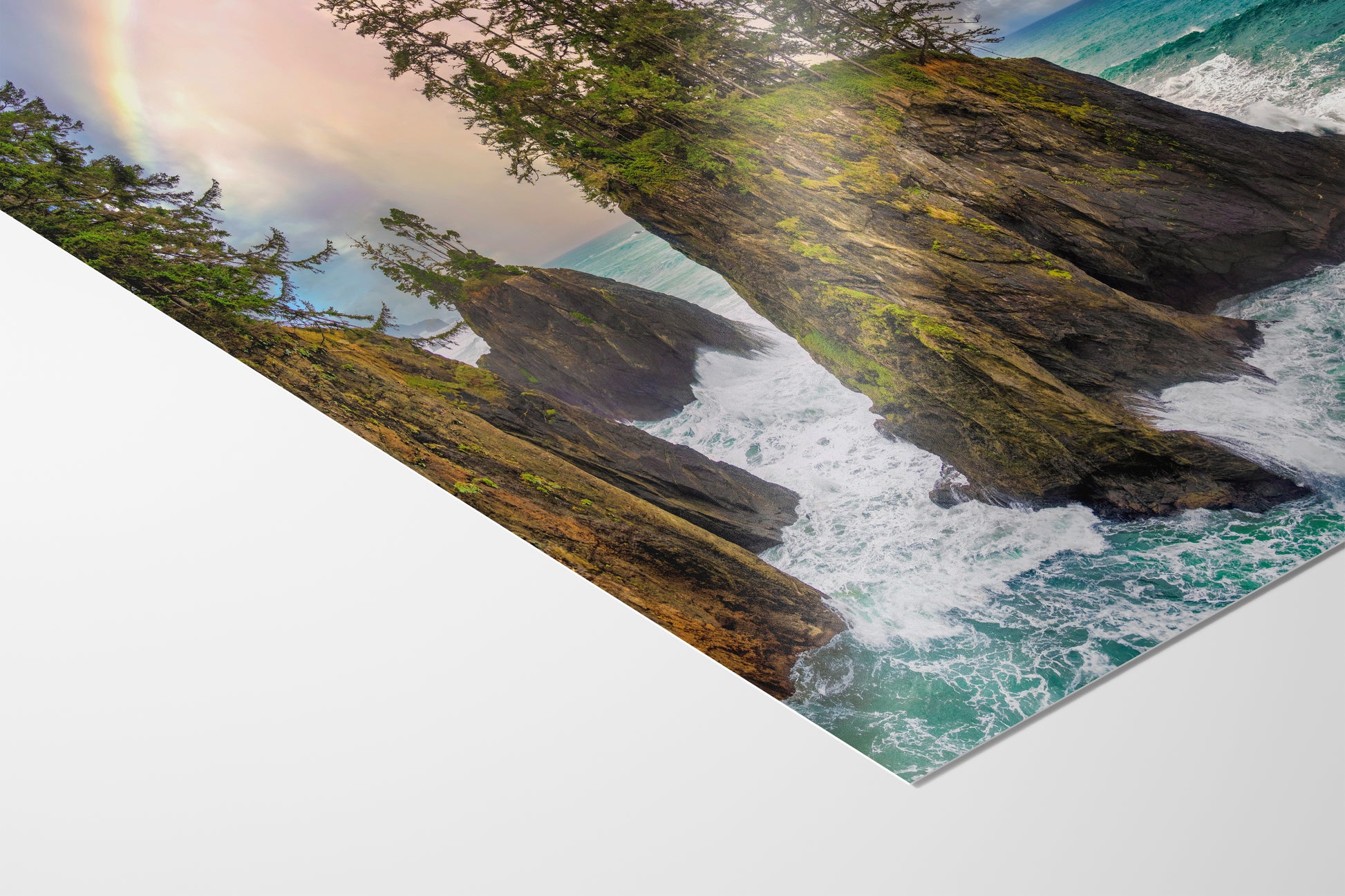 Capturing the natural elegance of the Pacific Northwest, this beach photo showcases the iconic Natural Bridges with waves gently crashing below and a vibrant rainbow arching across the sky. Perfect for adding a coastal touch to your home, office, dorm room, or meditation space, this ocean picture offers a tranquil escape from everyday life.