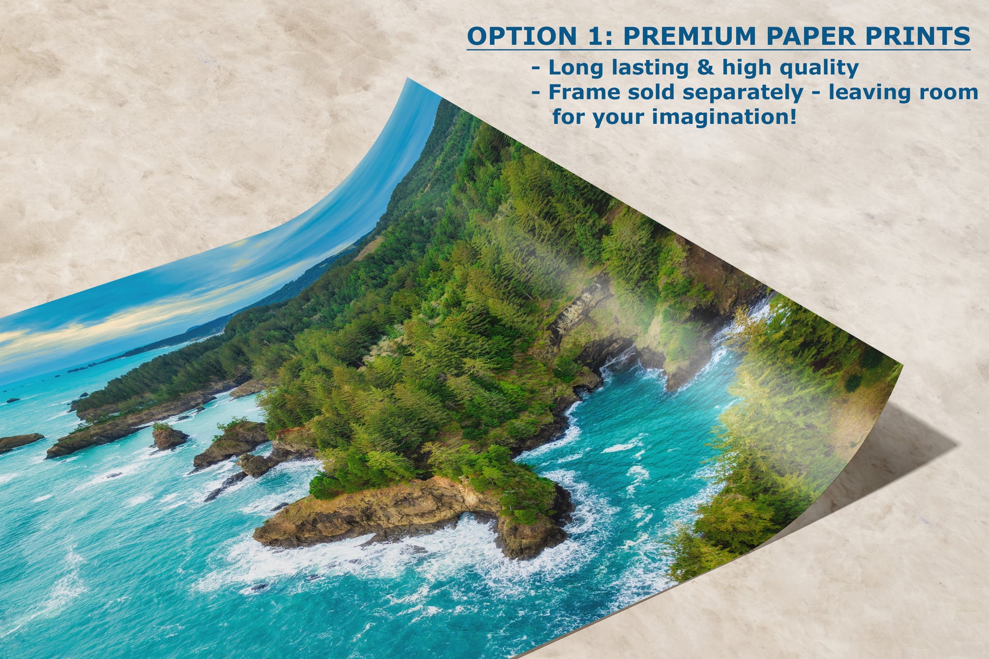 This nature photo print showcases the vibrant blues of the Pacific Ocean meeting lush green forests along the rugged coastline, making it an ideal piece for those seeking relaxation wall art or meditation room decor.