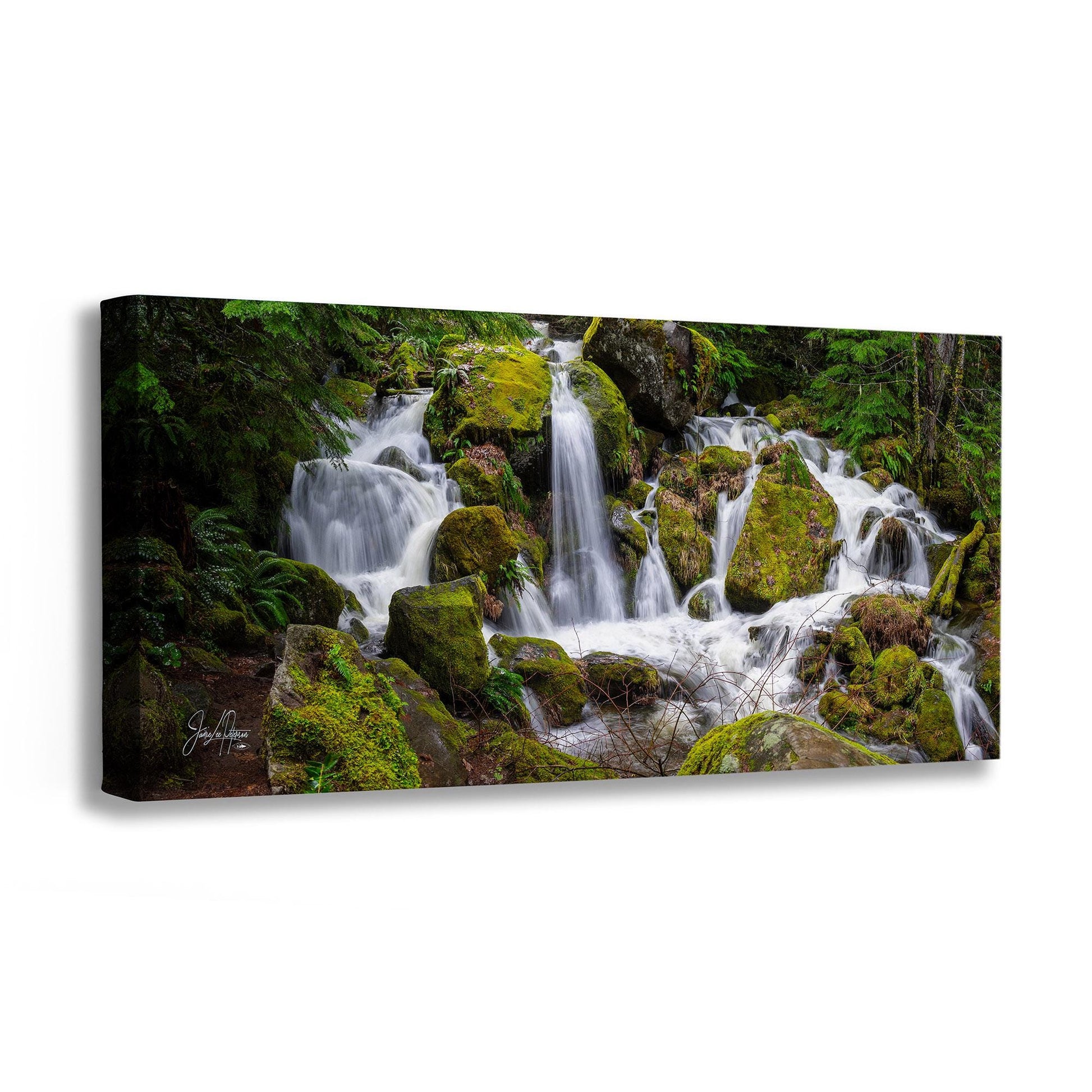 It's a nature photo of the pristine Pacific Northwest that captures the raw, tranquil essence of Oregon’s iconic landscapes. This relaxation artwork features cascading waterfalls flowing over moss-covered rocks, surrounded by lush greenery and vibrant forest details, embodying the peaceful spirit of the wilderness.