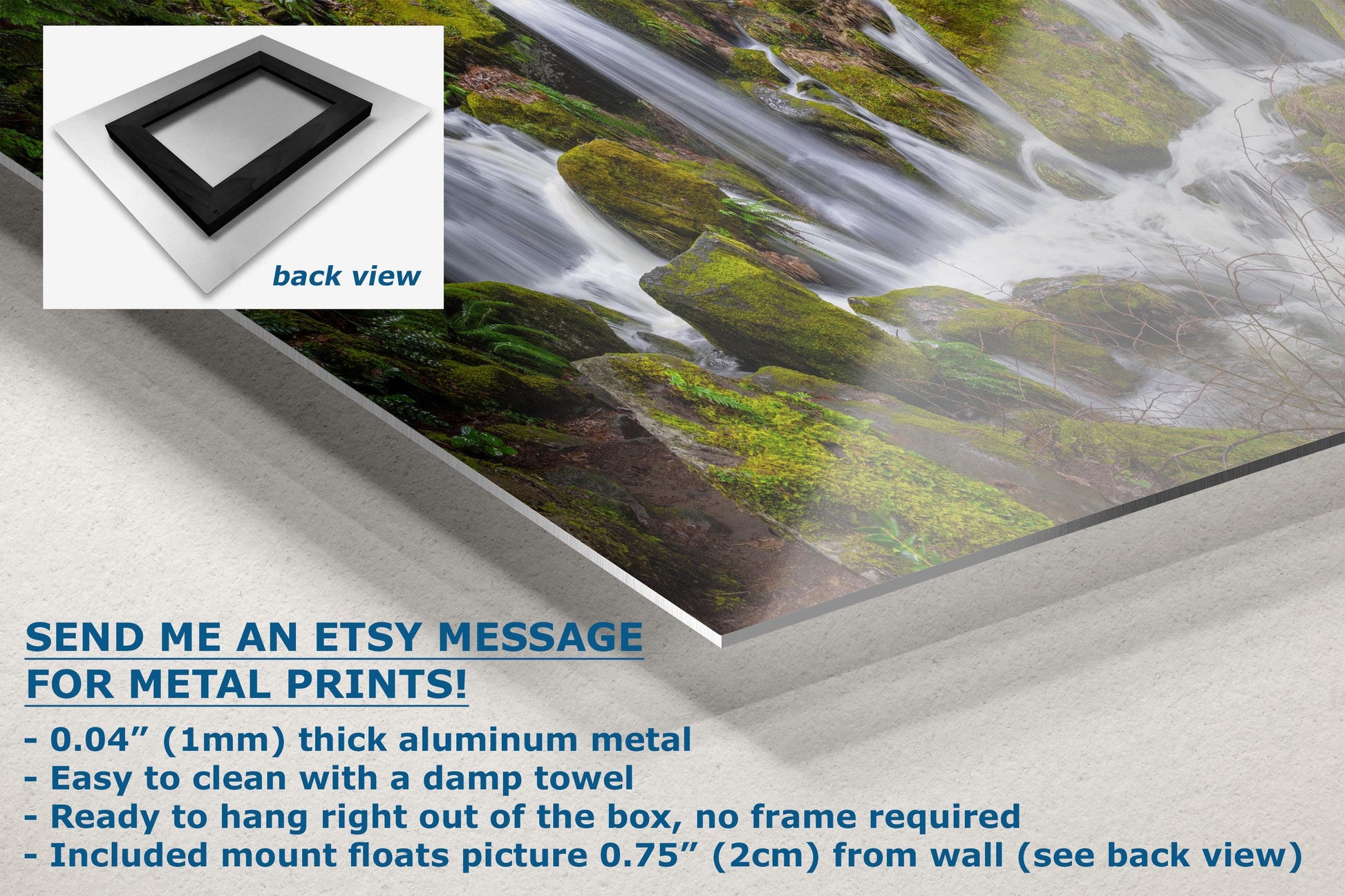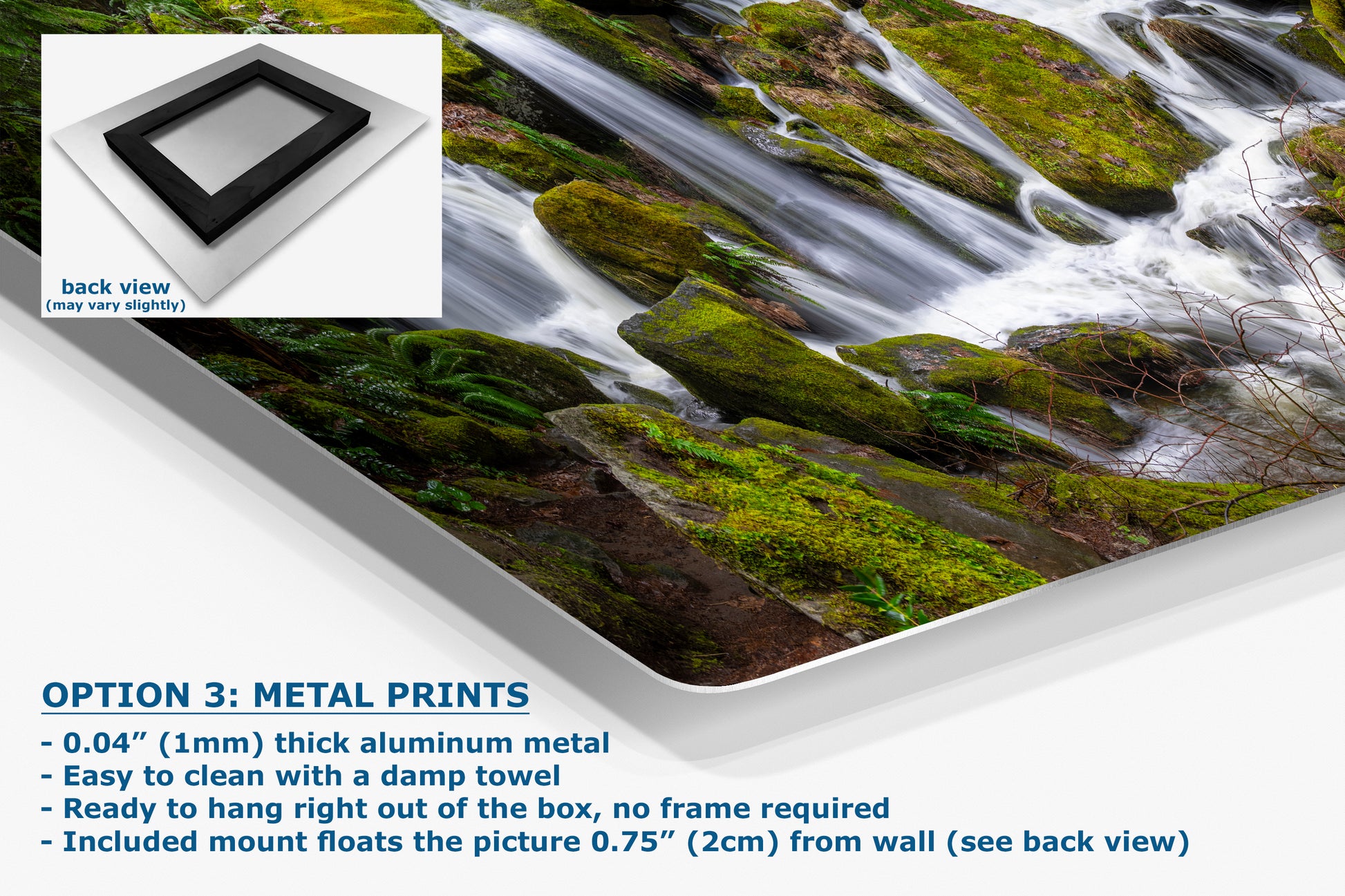 - Floating metal art: 0.04" (1mm) thick specialty coated aluminum metal includes a mount that floats the picture 0.75" (2cm) from your wall