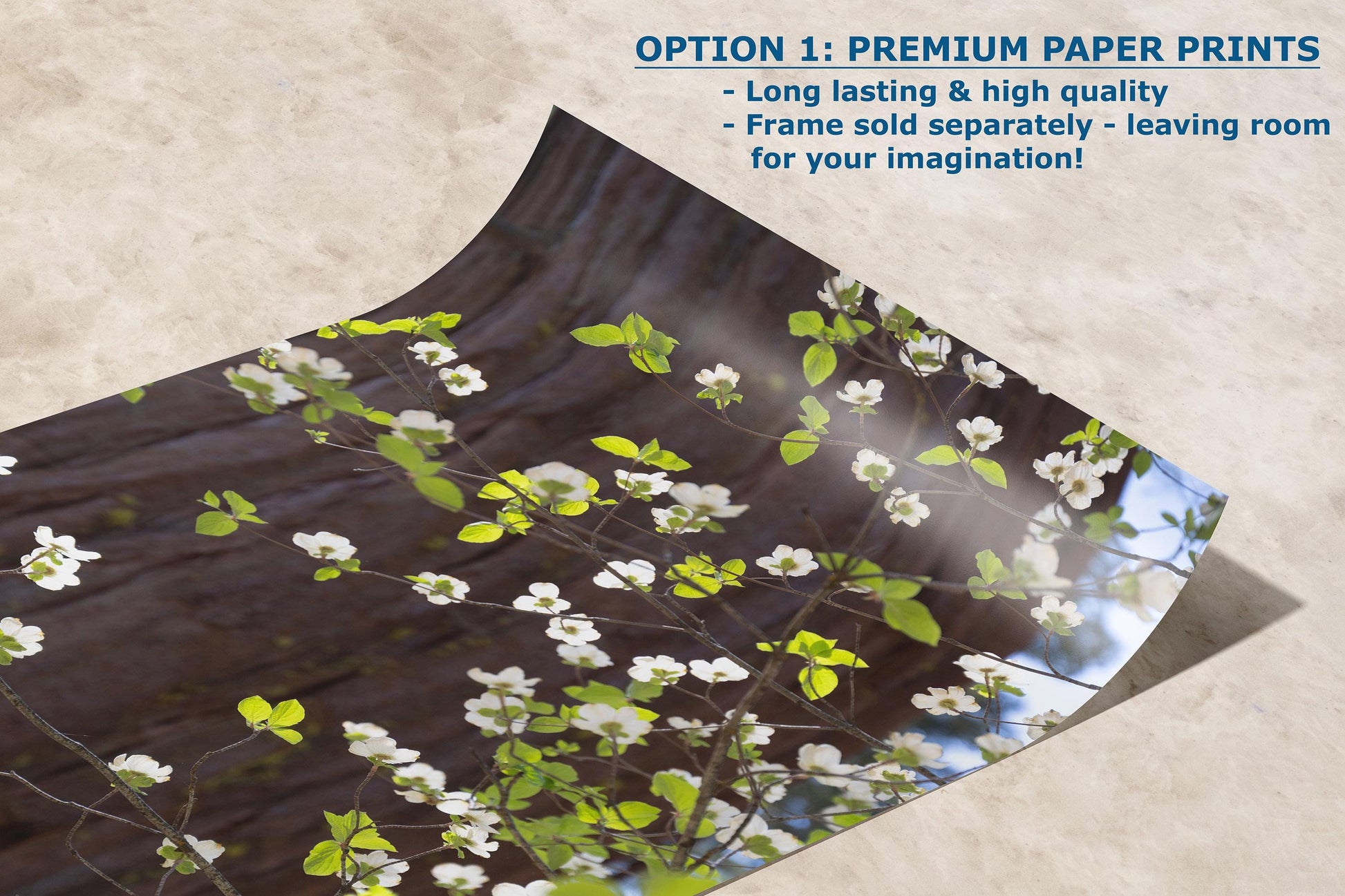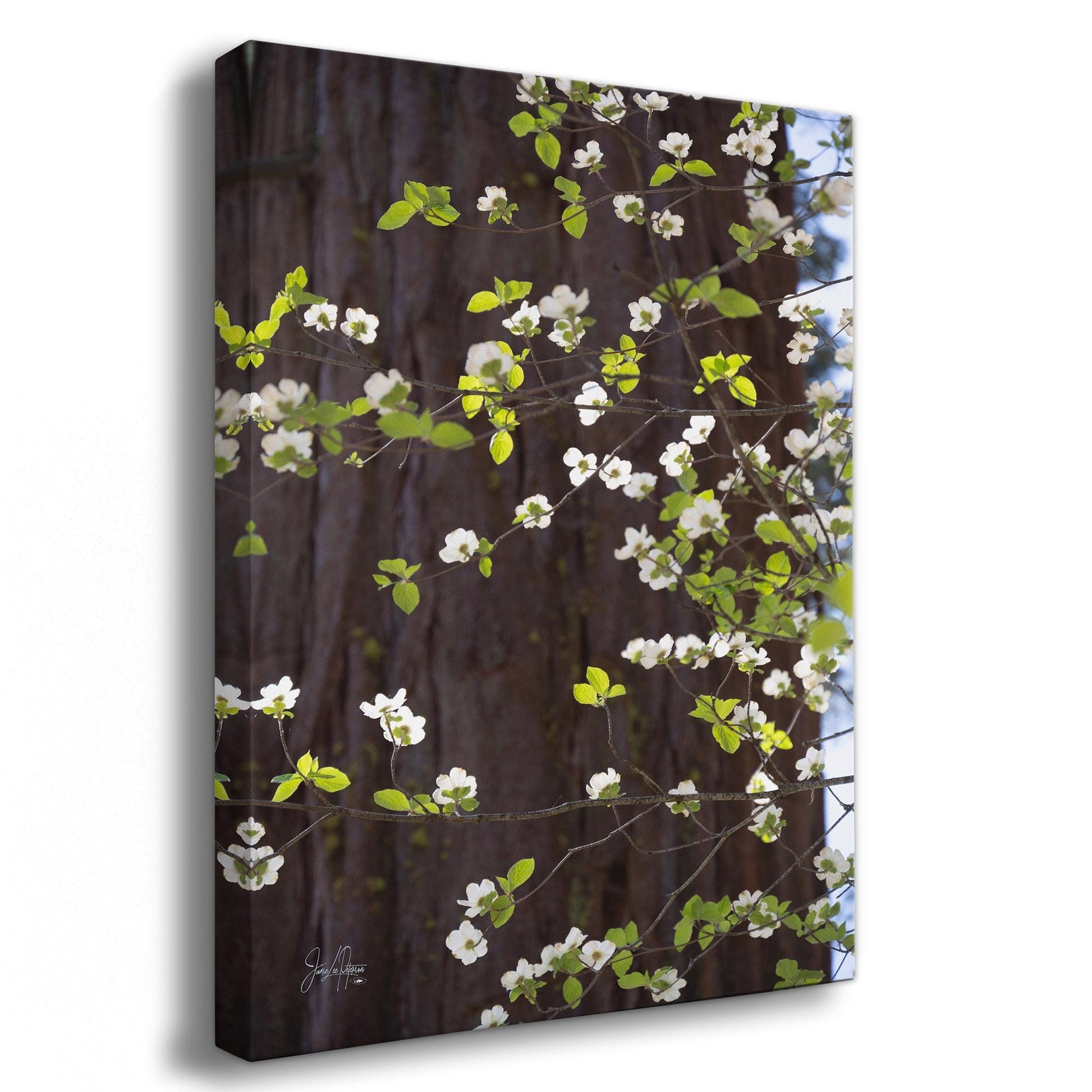 Featuring delicate white blossoms against the sturdy bark of a pine tree in Yosemite National Park, this forest bathing-inspired artwork evokes tranquility, renewal, and the fresh breath of the wilderness.