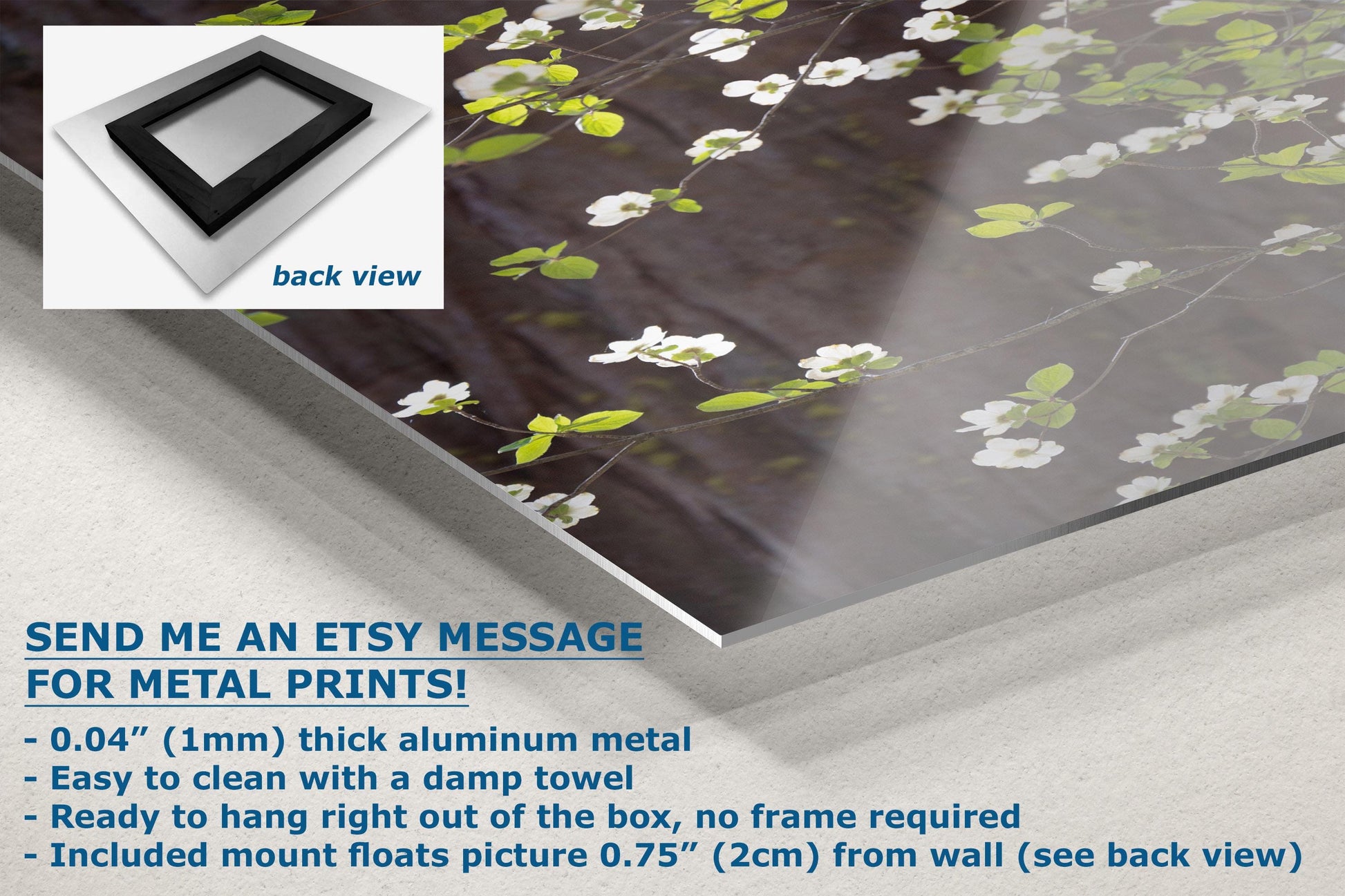 - Floating metal art: 0.04" (1mm) thick specialty coated aluminum metal includes a mount that floats the picture 0.75" (2cm) from your wall
