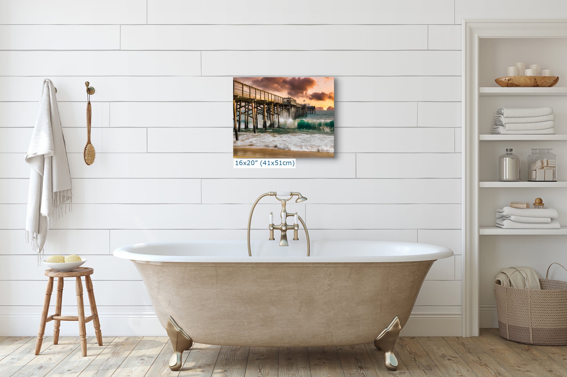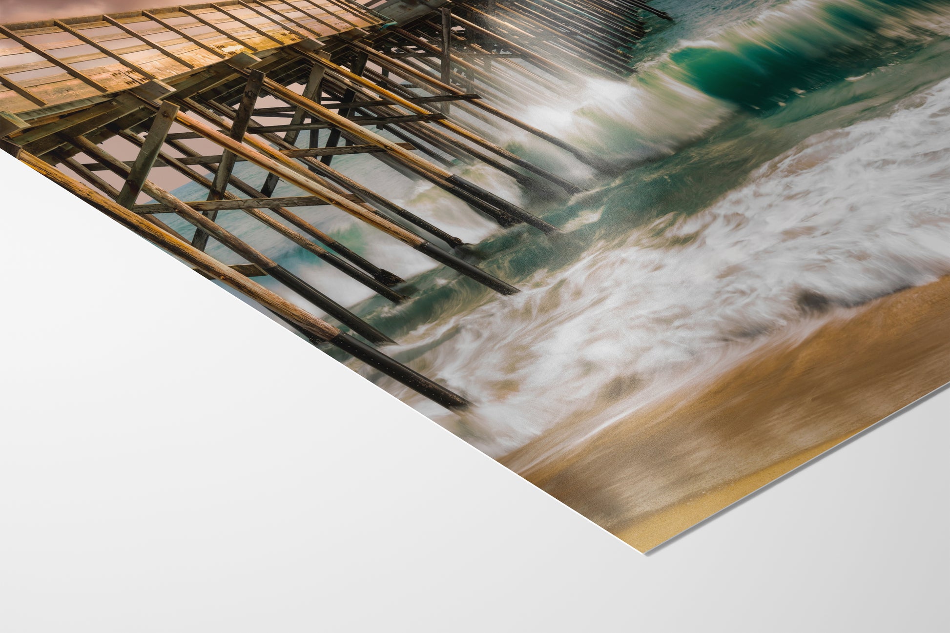 Perfect for adding a touch of serenity and coastal charm to any space, this relaxation artwork showcases waves crashing energetically against the sturdy pier, with hues of emerald green and frothy white blending seamlessly into the sandy shore. The sky, painted in soft blush pink and fiery orange, evokes a dramatic twilight scene that radiates calm and resilience.