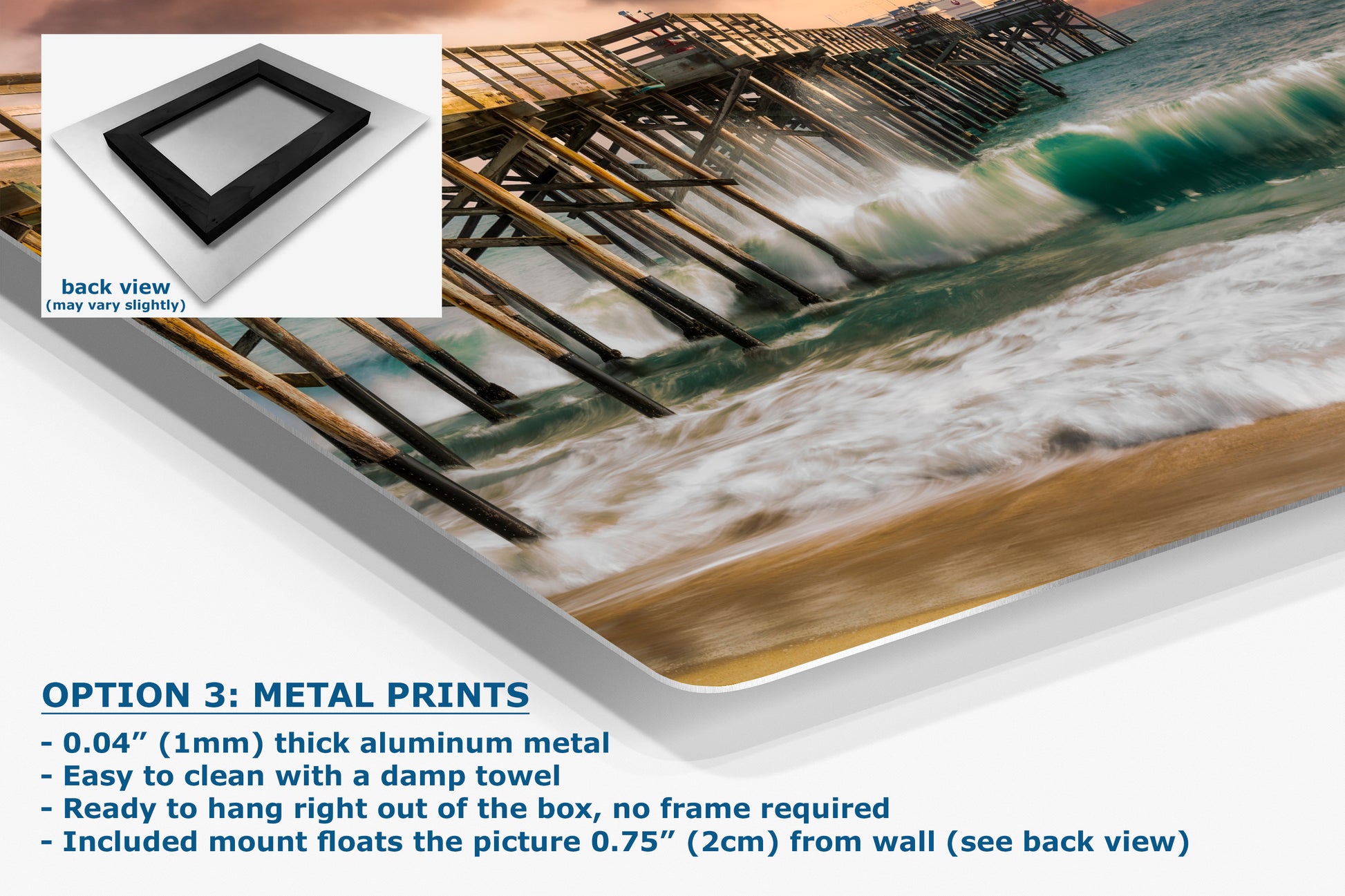 - Floating metal art: 0.04" (1mm) thick specialty coated aluminum metal includes a mount that floats the picture 0.75" (2cm) from your wall
