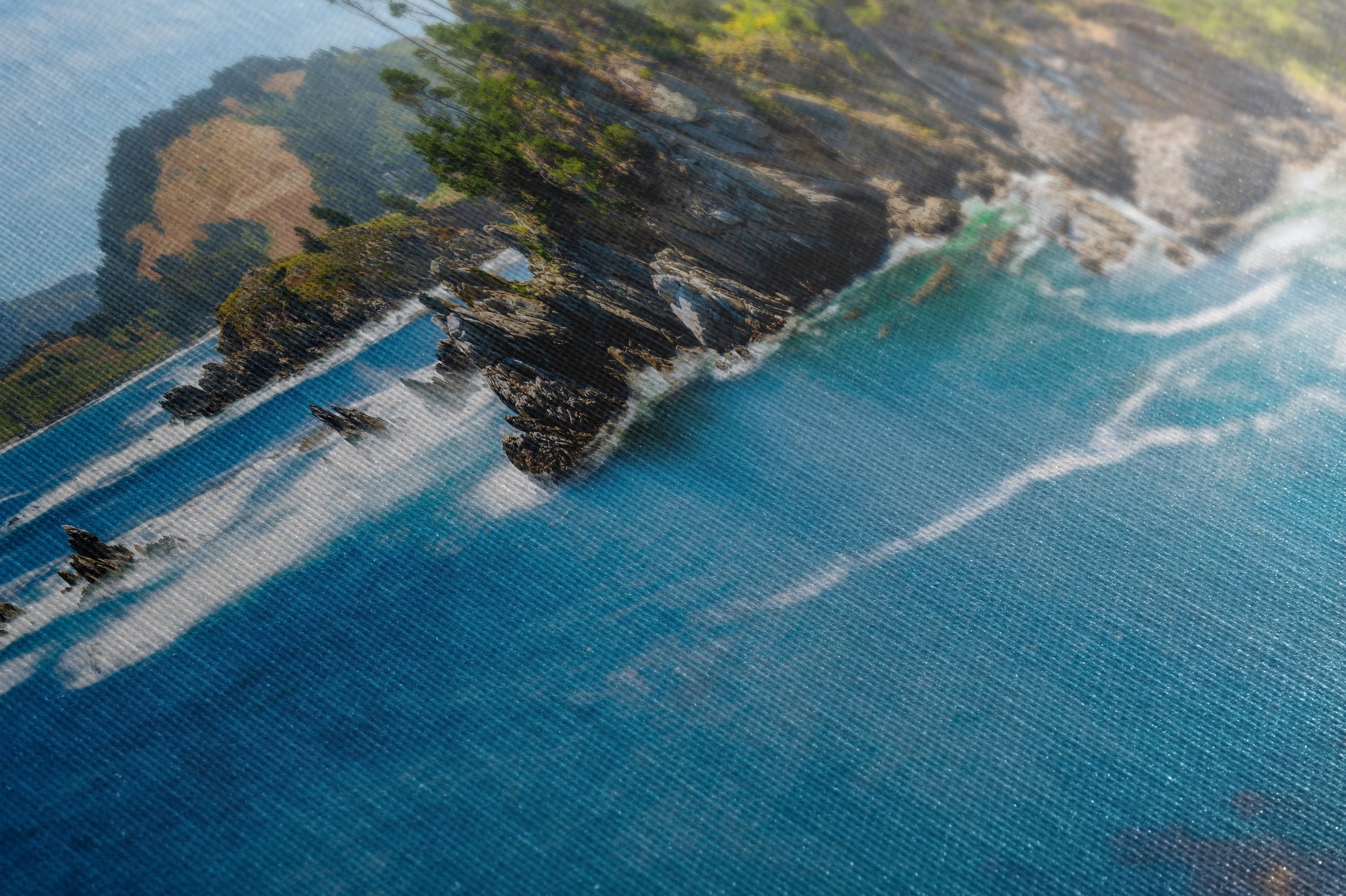This vibrant nature photo captures the vivid blues of the ocean meeting rugged cliffs met with lush greenery, bringing a sense of calm and serenity to your home, office, dorm, or meditation space.