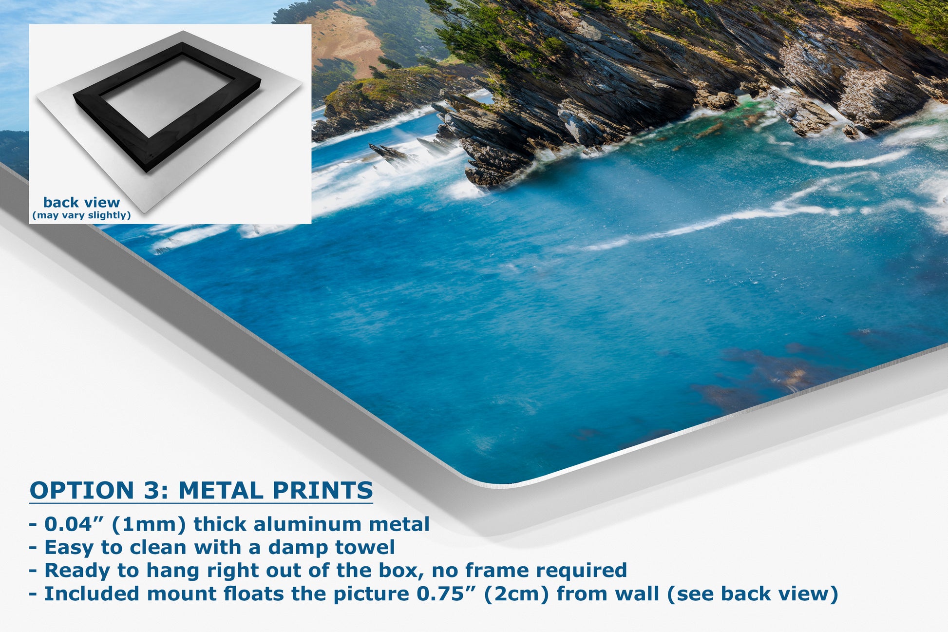 - Floating metal art: 0.04" (1mm) thick specialty coated aluminum metal includes a mount that floats the picture 0.75" (2cm) from your wall