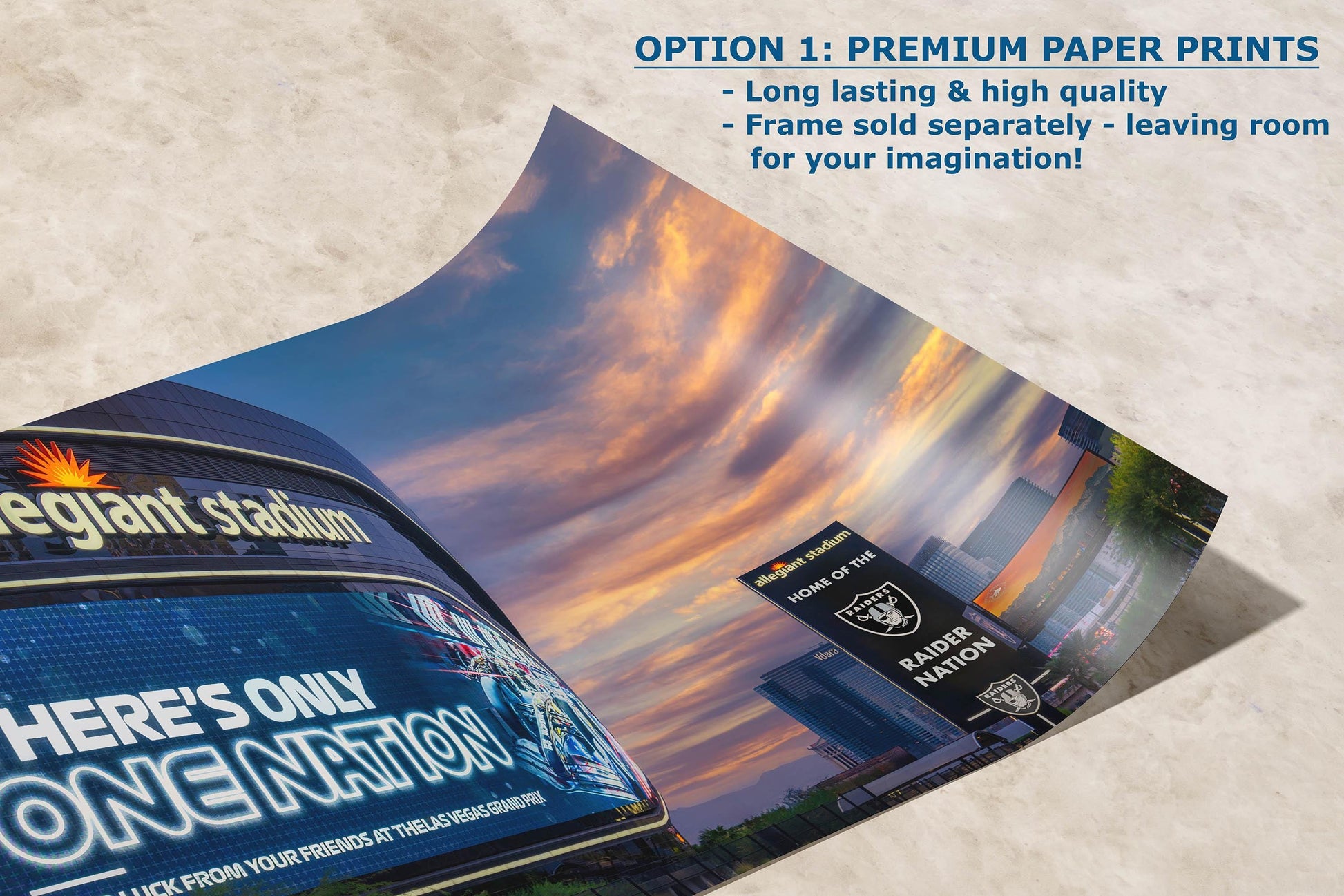 Celebrate the iconic Allegiant Stadium with this striking photographic print, capturing the new home of the Raiders in Las Vegas, shown against a stunning sunset sky. This piece brings the electrifying energy of Raider Nation and the grandeur of NFL football into your space, making it a must-have for any true fan.