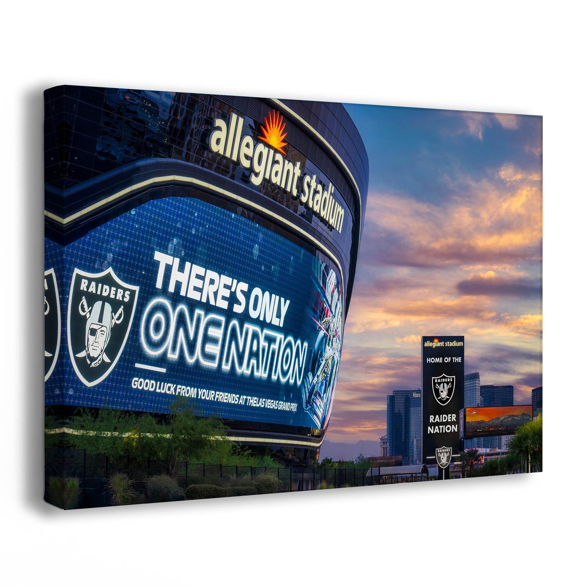 Iconic Allegiant Stadium: Showcases the home of the Raiders with "One Nation" proudly displayed, embodying the spirit of Las Vegas and Raider fans.