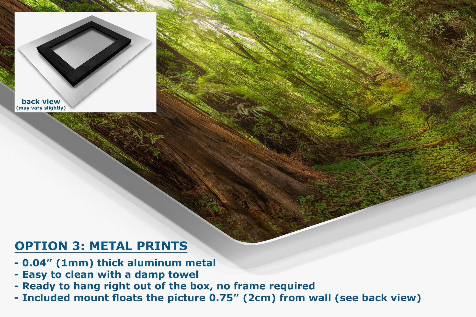- Floating metal art: 0.04" (1mm) thick specialty coated aluminum metal includes a mount that floats the picture 0.75" (2cm) from your wall