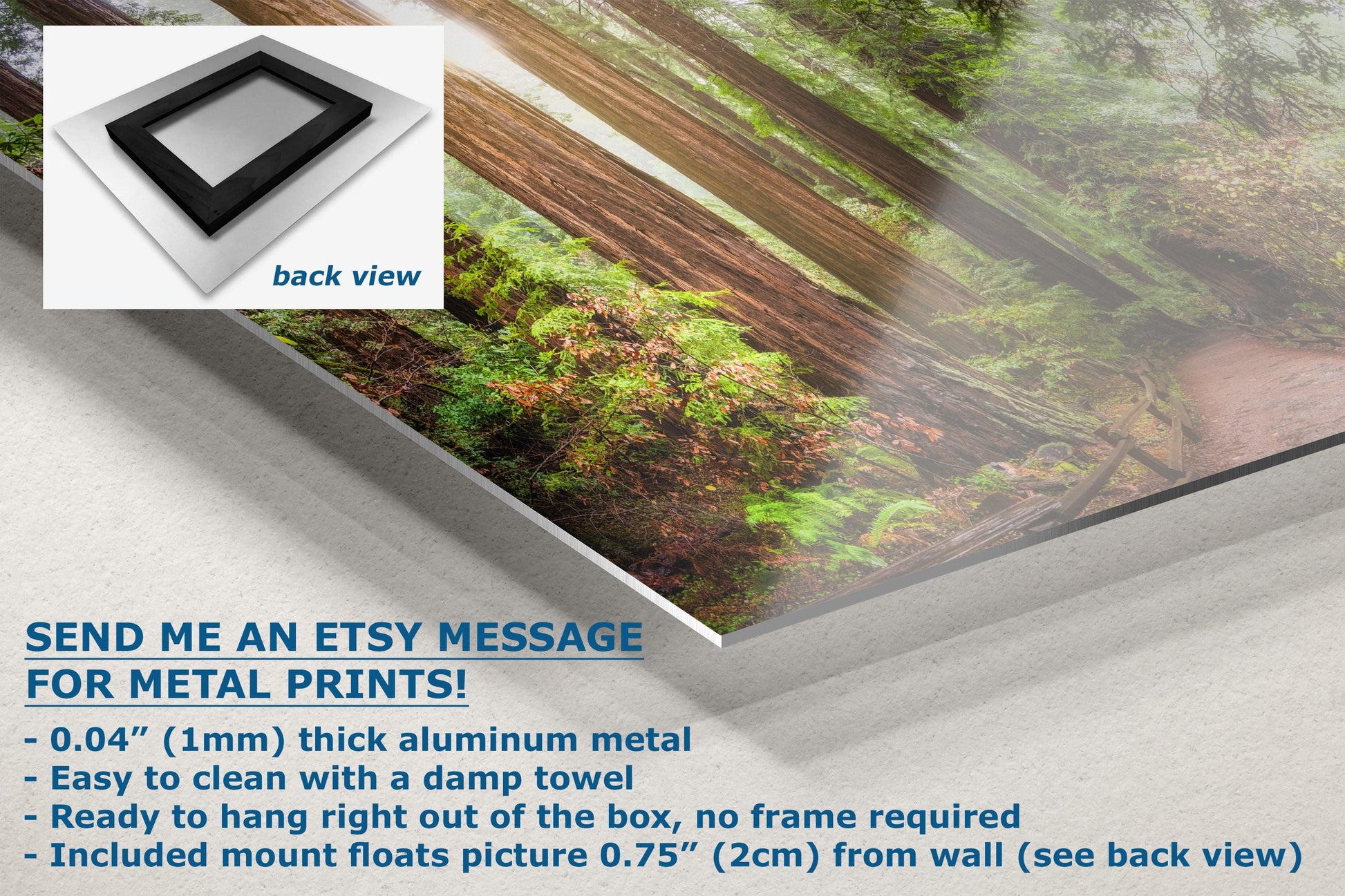 - Floating metal art: 0.04" (1mm) thick specialty coated aluminum metal includes a mount that floats the picture 0.75" (2cm) from your wall