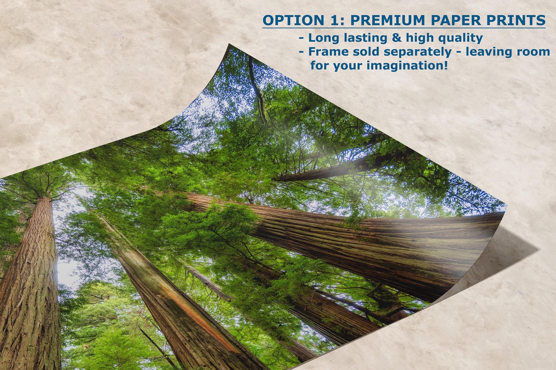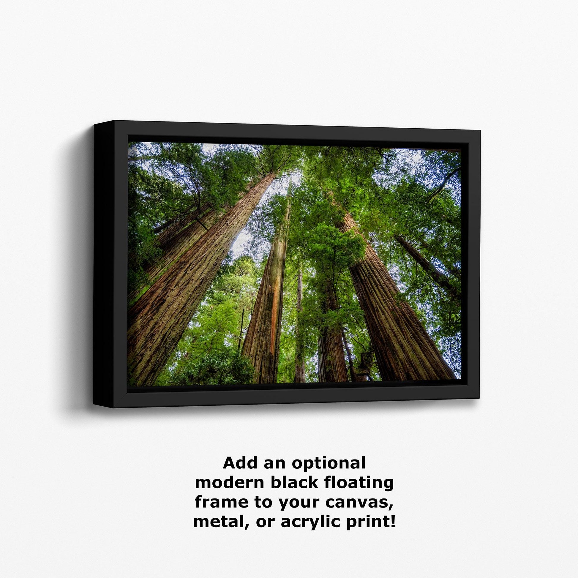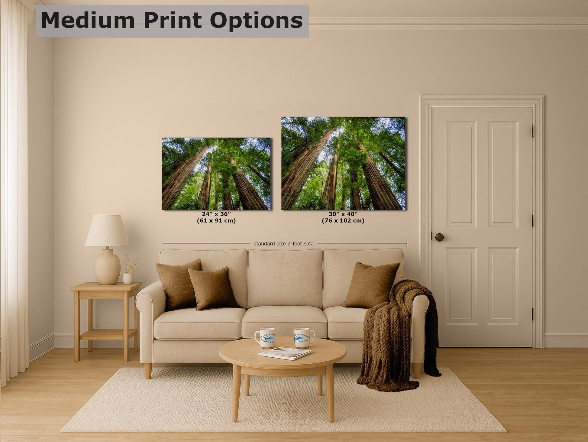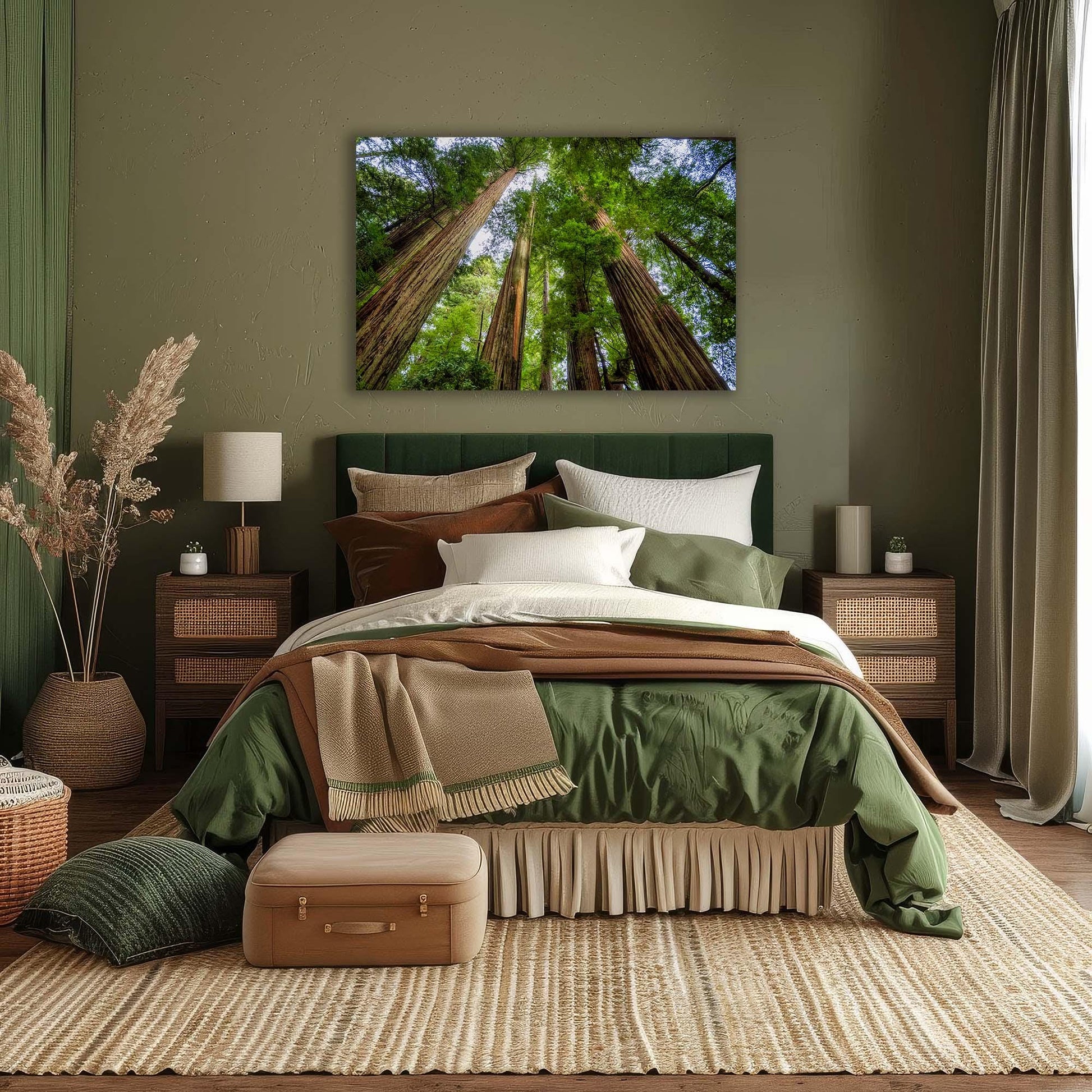 Perfect for tree lovers and nature enthusiasts, this captivating wall art captures the majestic grandeur of towering redwoods reaching toward the sky, their lush green foliage creating a lush canopy overhead.