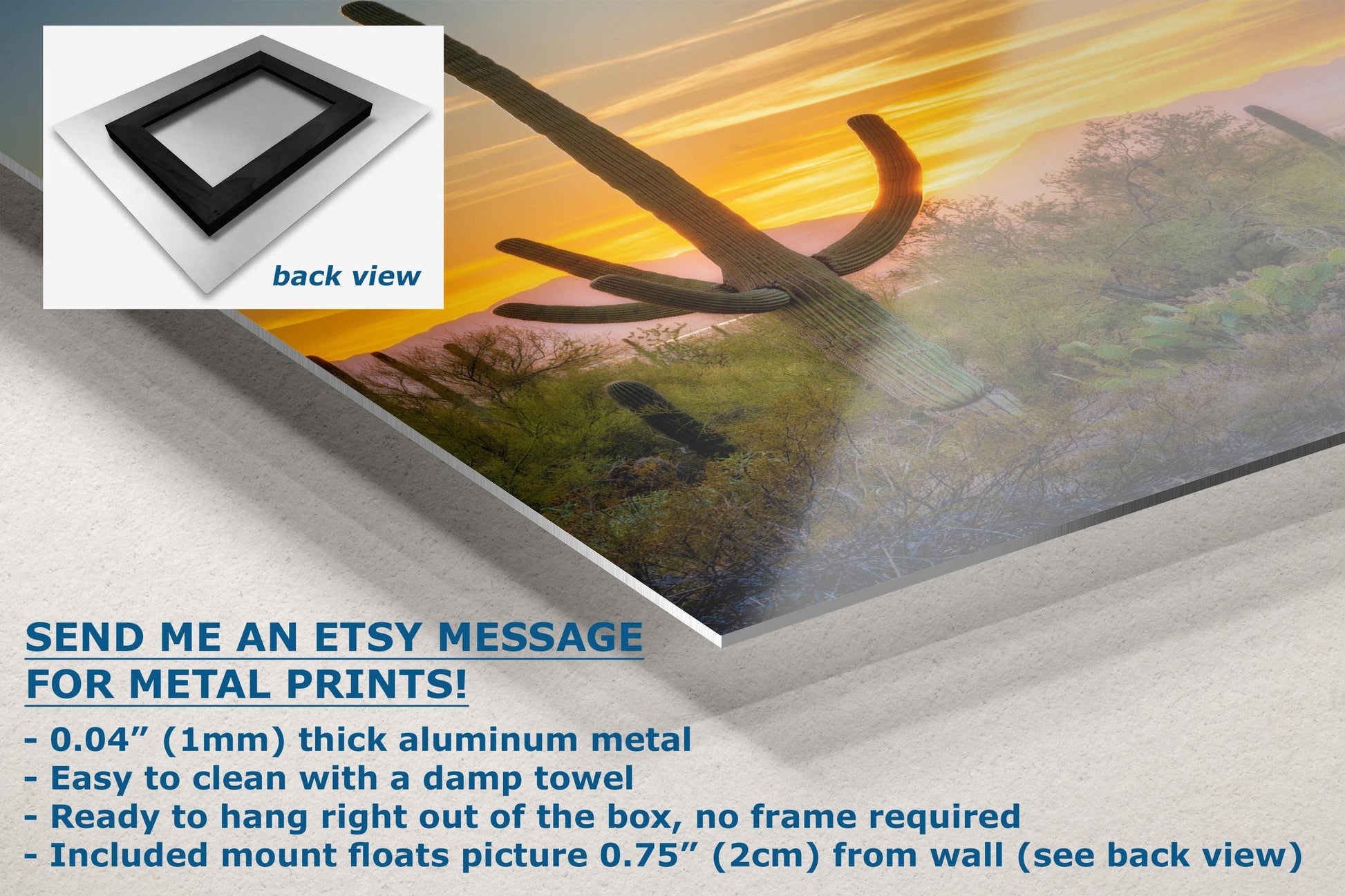 - Floating metal art: 0.04" (1mm) thick specialty coated aluminum metal includes a mount that floats the picture 0.75" (2cm) from your wall