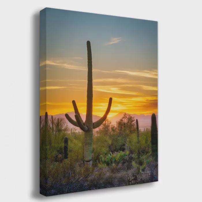 Capturing the iconic saguaro cactus against a vibrant sunset, this artwork embodies the resilience and tranquility of the southwestern landscape. Perfect for adding a touch of nature’s grandeur to any space, it brings the magic of the Sonoran Desert into your home or office.