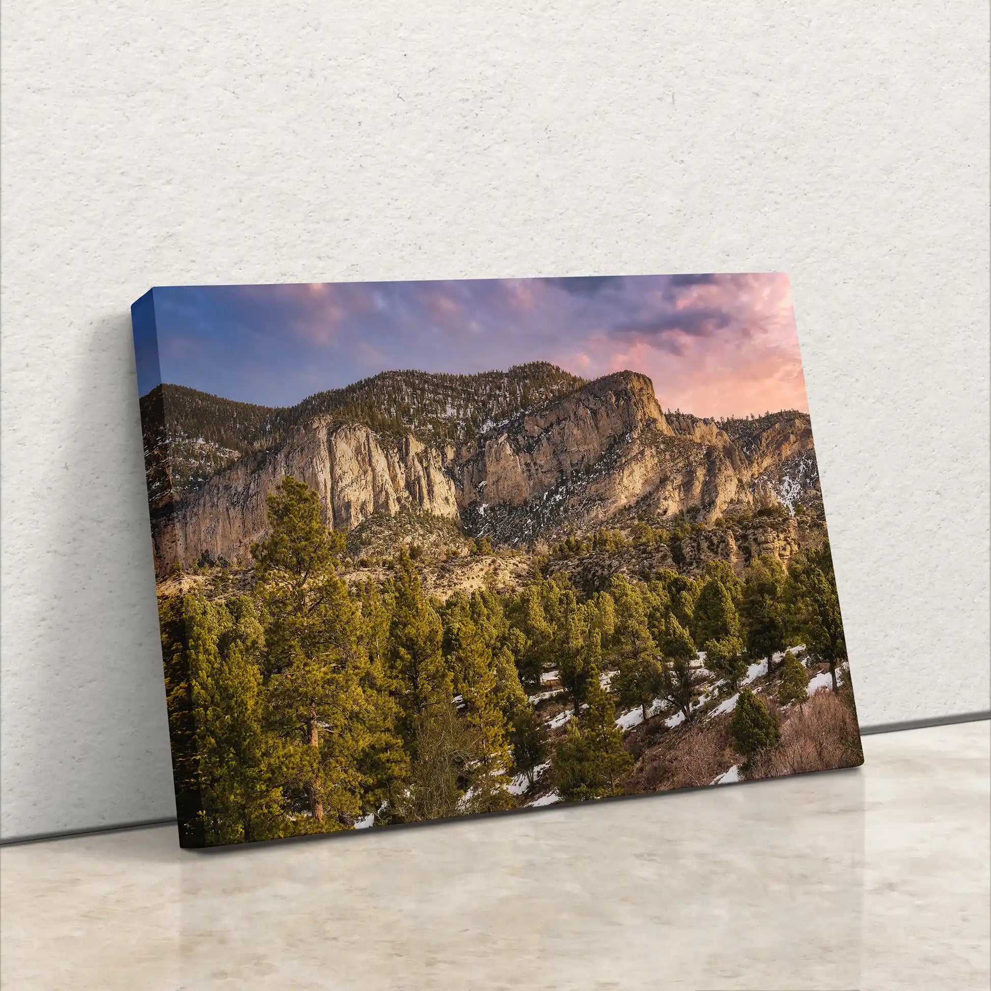 Captured just after sunrise near Fletcher Peak, this snowy landscape showcases the serene and majestic essence of winter in the Nevada mountains. Perfect for adding a touch of tranquility and scenic charm to your home or office, this piece transforms any space into a peaceful retreat.