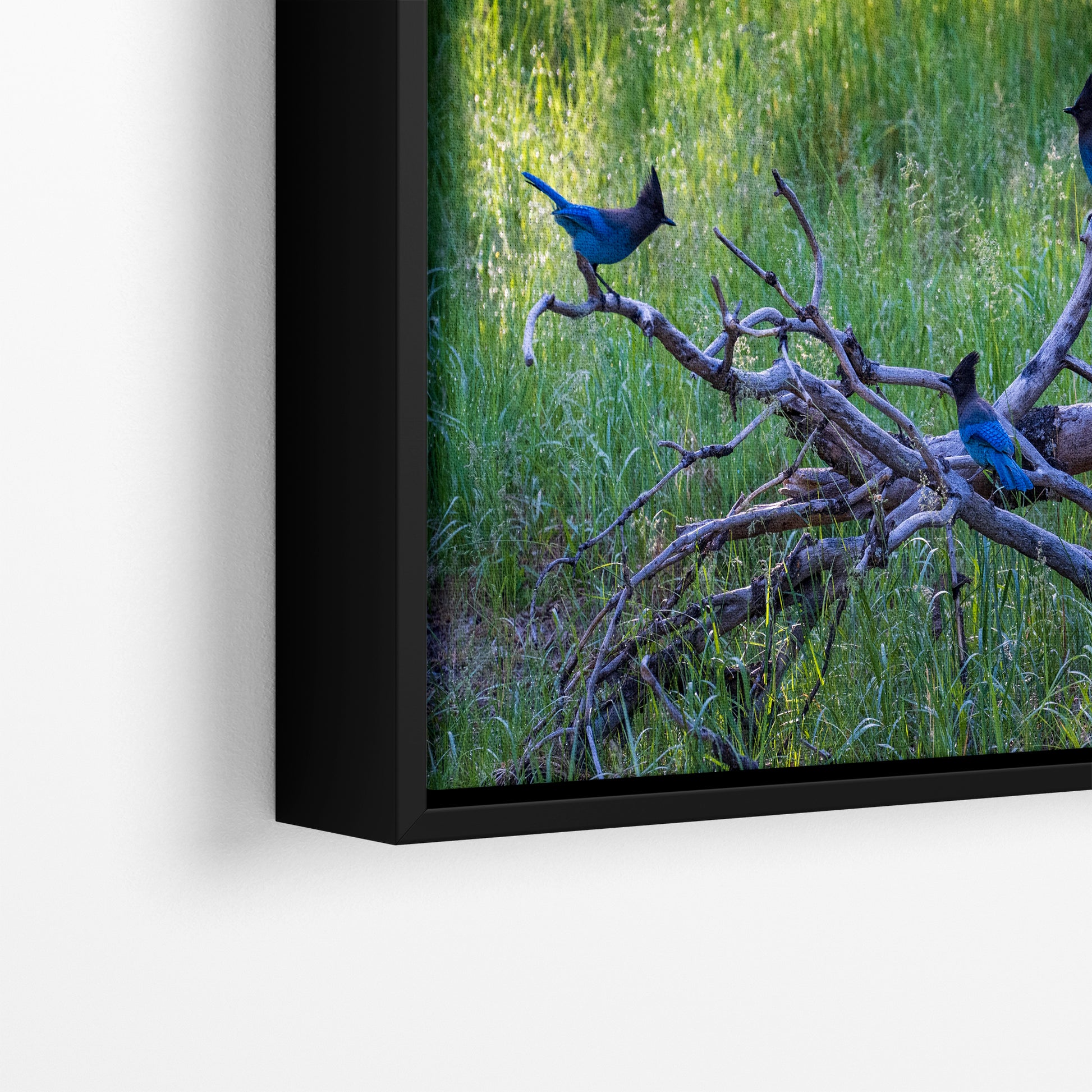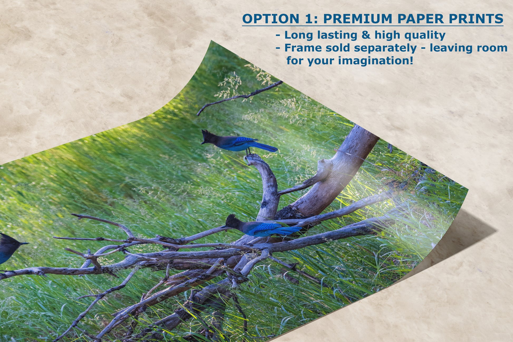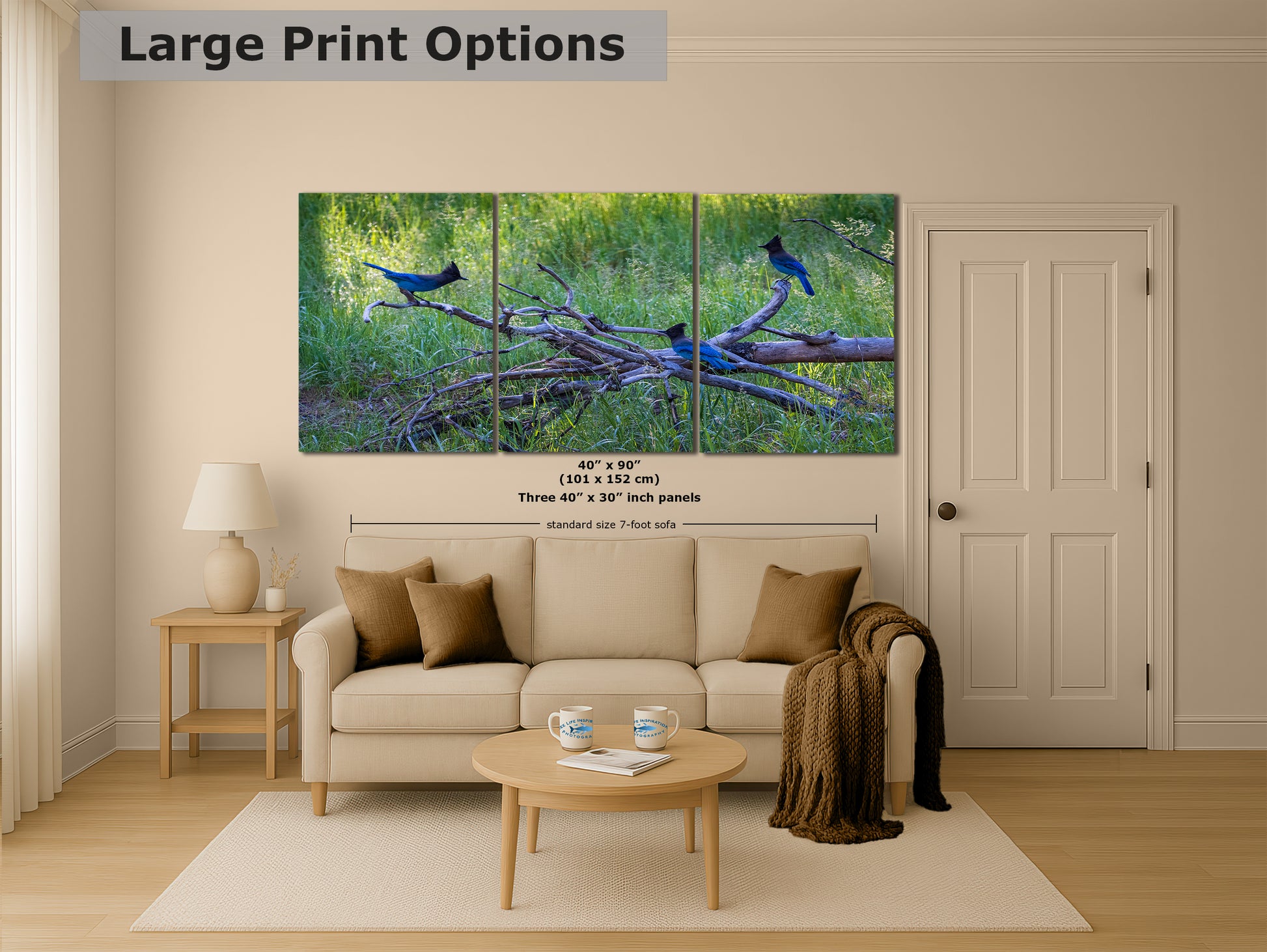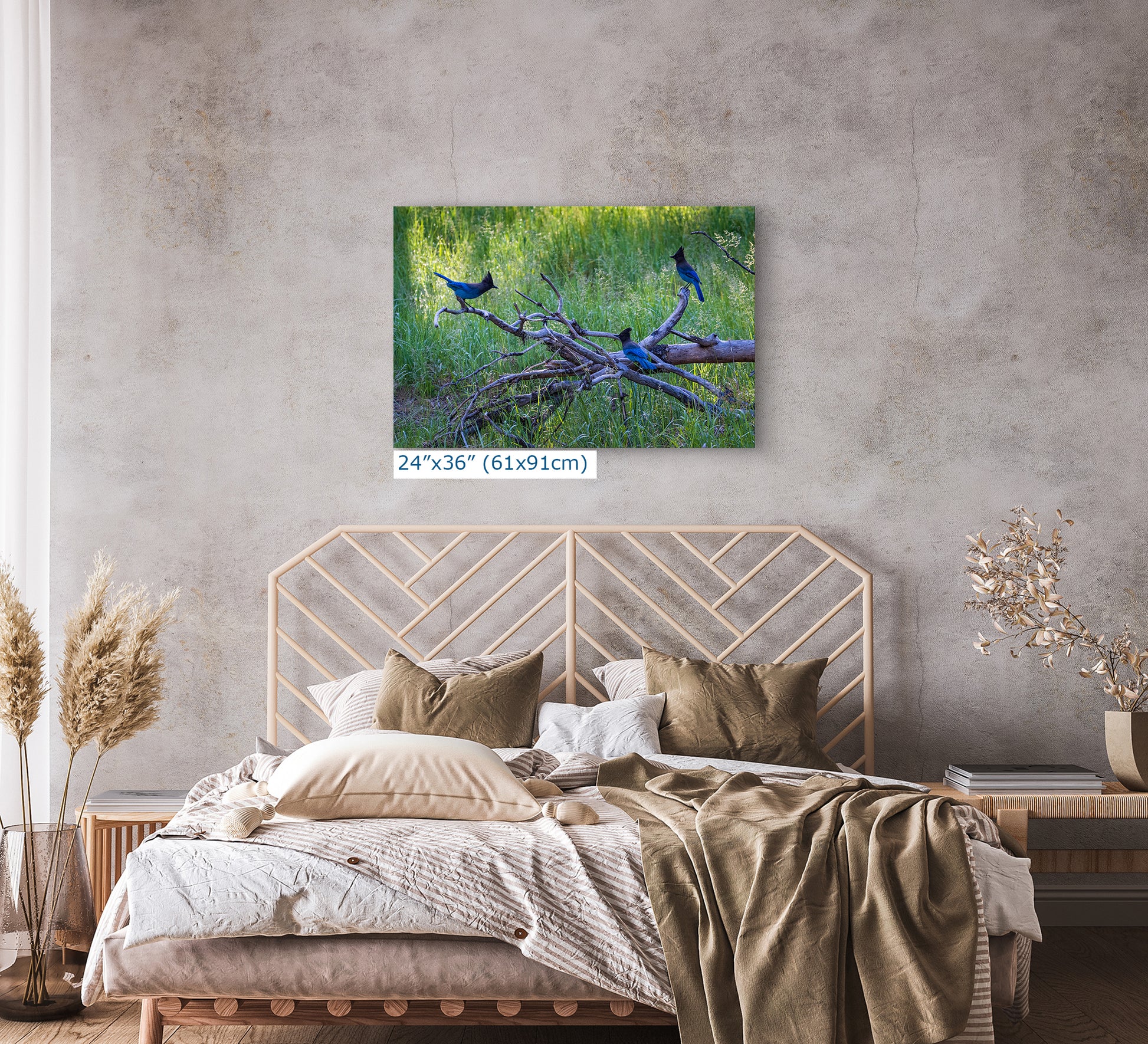 Featuring three vibrant blue Steller Jays perched on a fallen branch amidst lush greenery, this bird wall art captures the peaceful essence of Yosemite National Park. Perfect for nature lovers and bird enthusiasts, this bluebird picture offers a calming and inspiring focal point for any room.