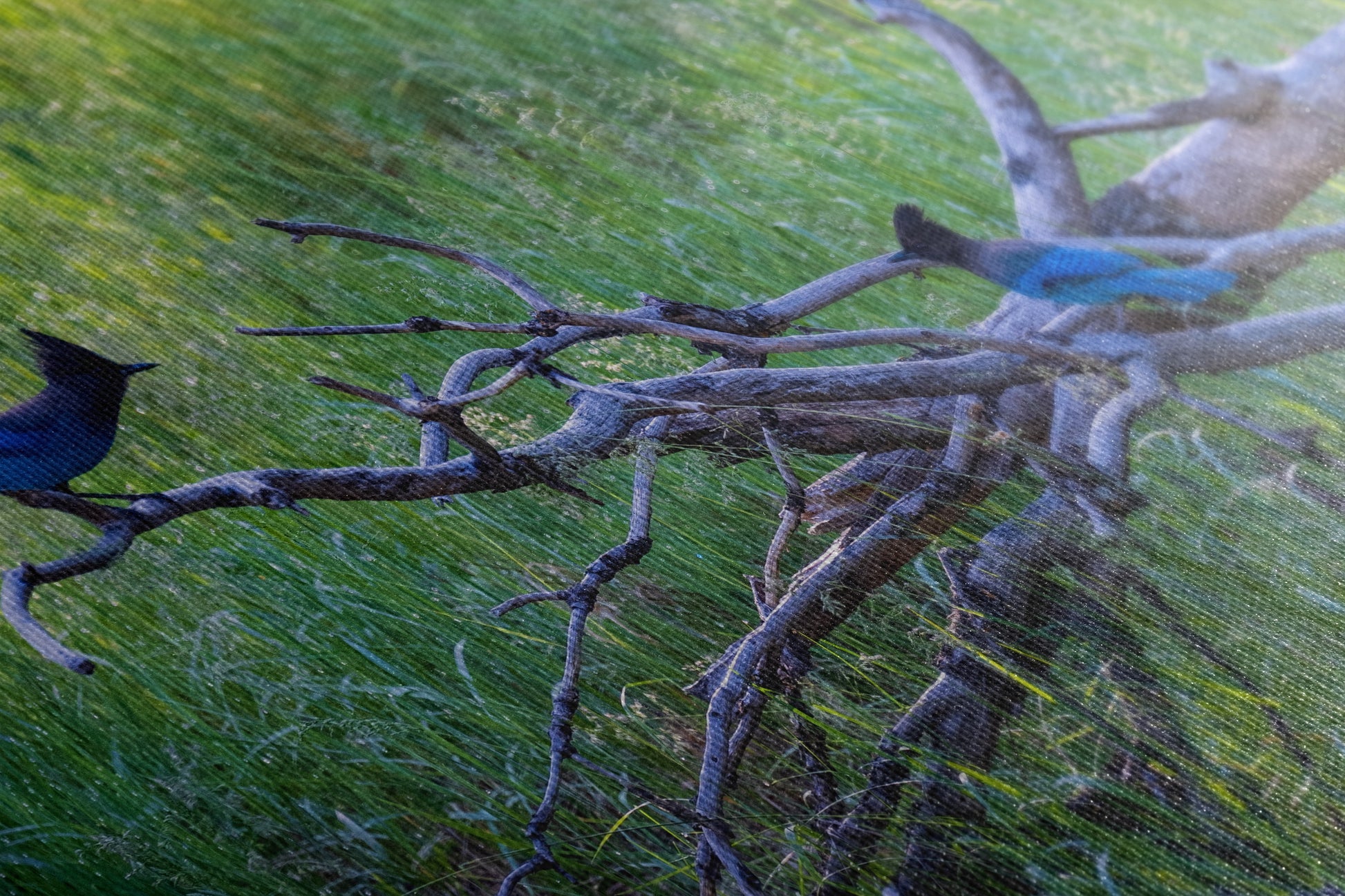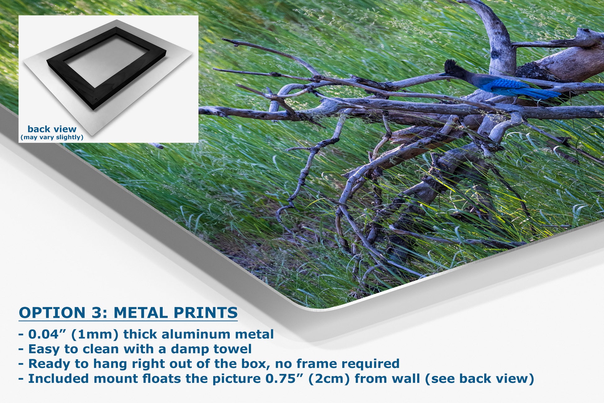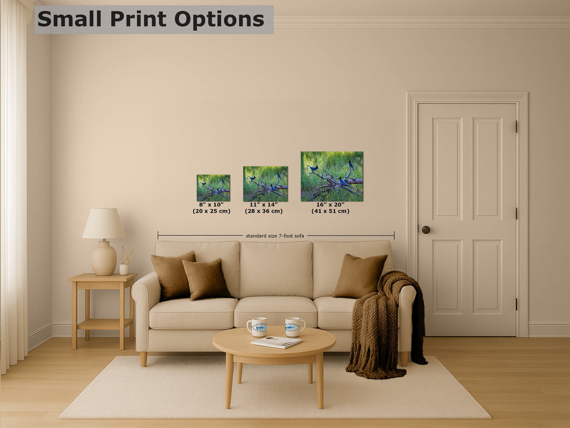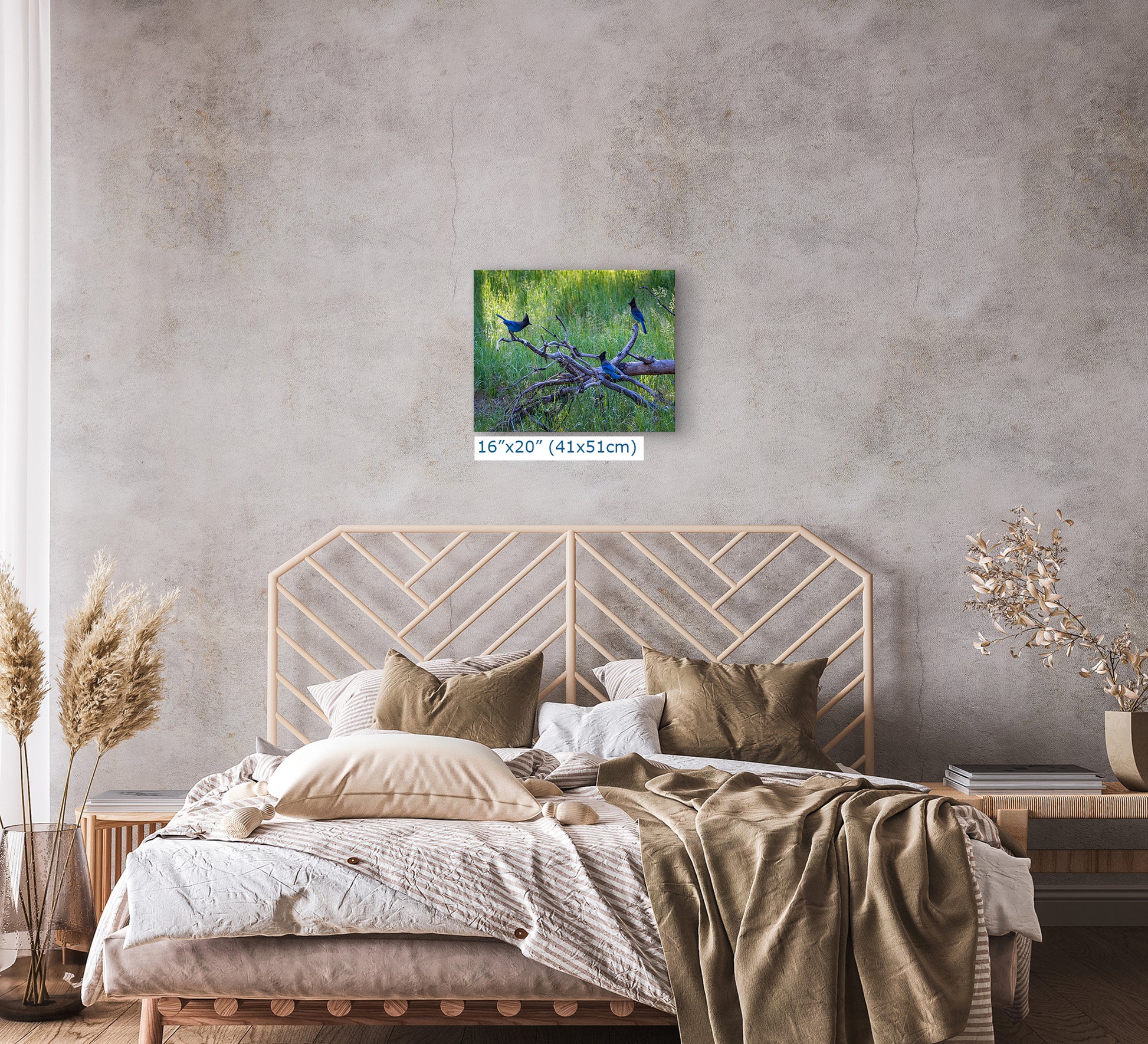 Featuring three vibrant blue Steller Jays perched on a fallen branch amidst lush greenery, this bird wall art captures the peaceful essence of Yosemite National Park. Perfect for nature lovers and bird enthusiasts, this bluebird picture offers a calming and inspiring focal point for any room.