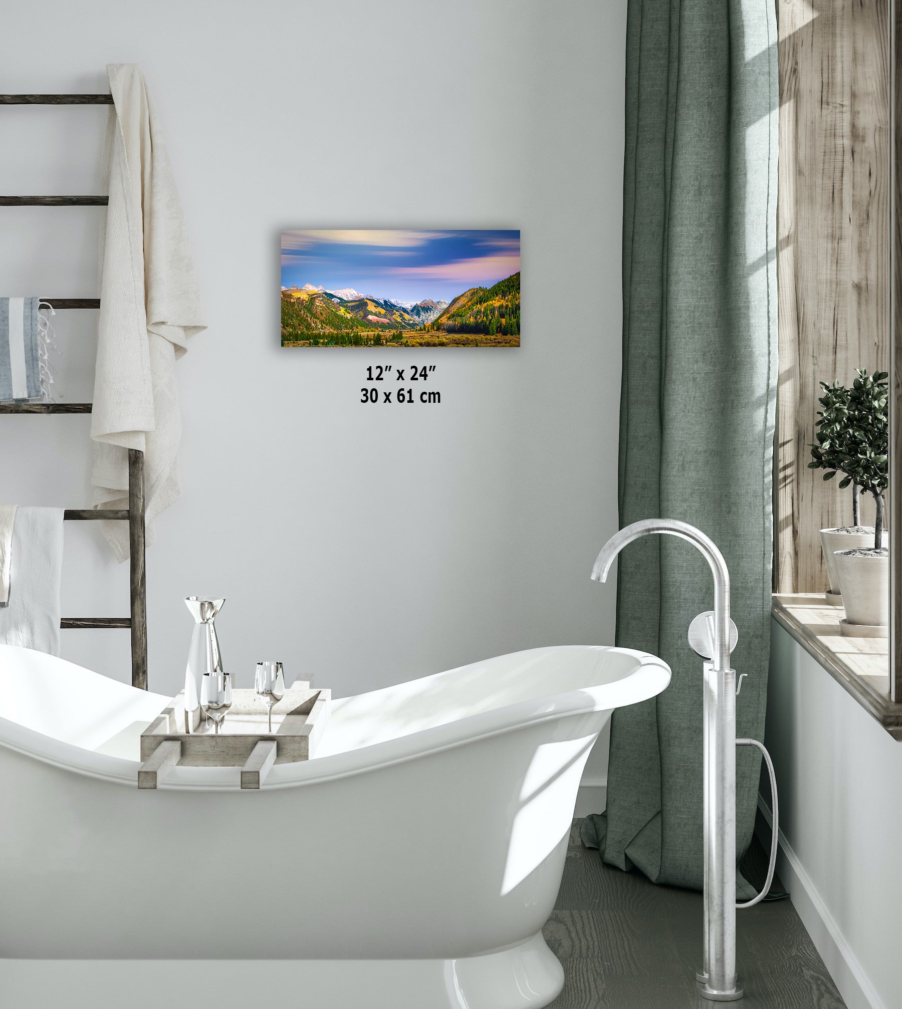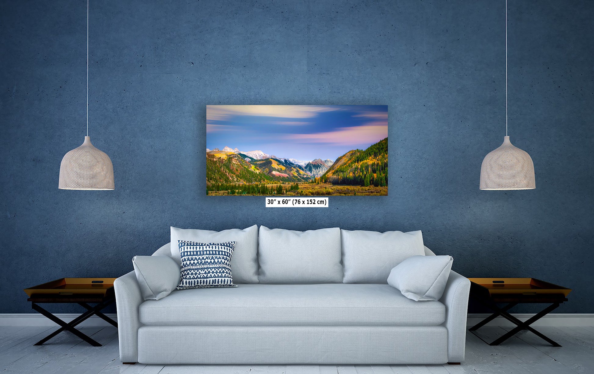Capturing a panoramic view of Telluride's vibrant fall landscape, this artwork showcases the full spectrum of autumn hues, from golden aspens to lush green pines against majestic snow-capped peaks. Perfect for adding a touch of serenity and natural splendor to your home or office decor.
