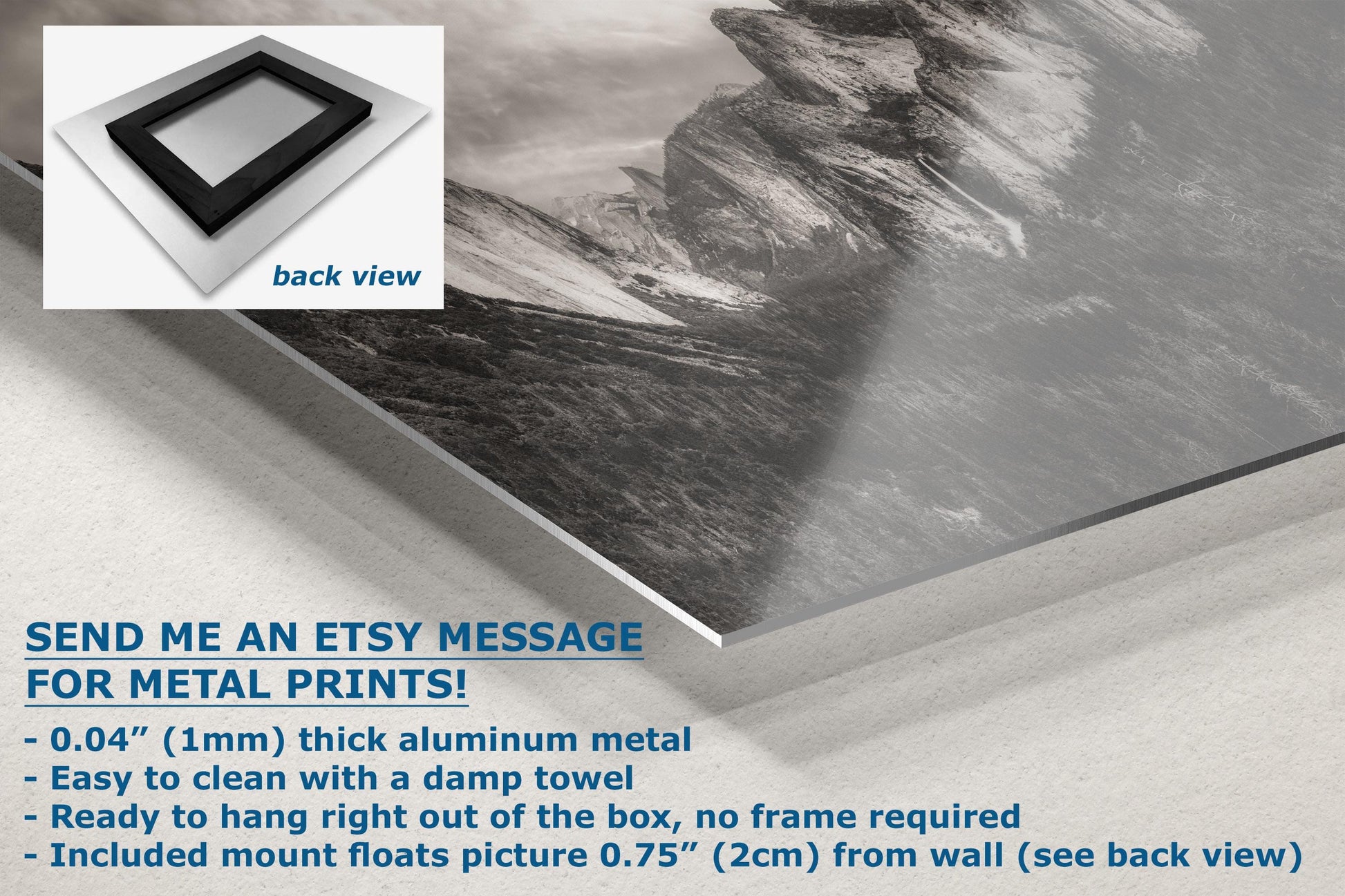 - Floating metal art: 0.04" (1mm) thick specialty coated aluminum metal includes a mount that floats the picture 0.75" (2cm) from your wall
