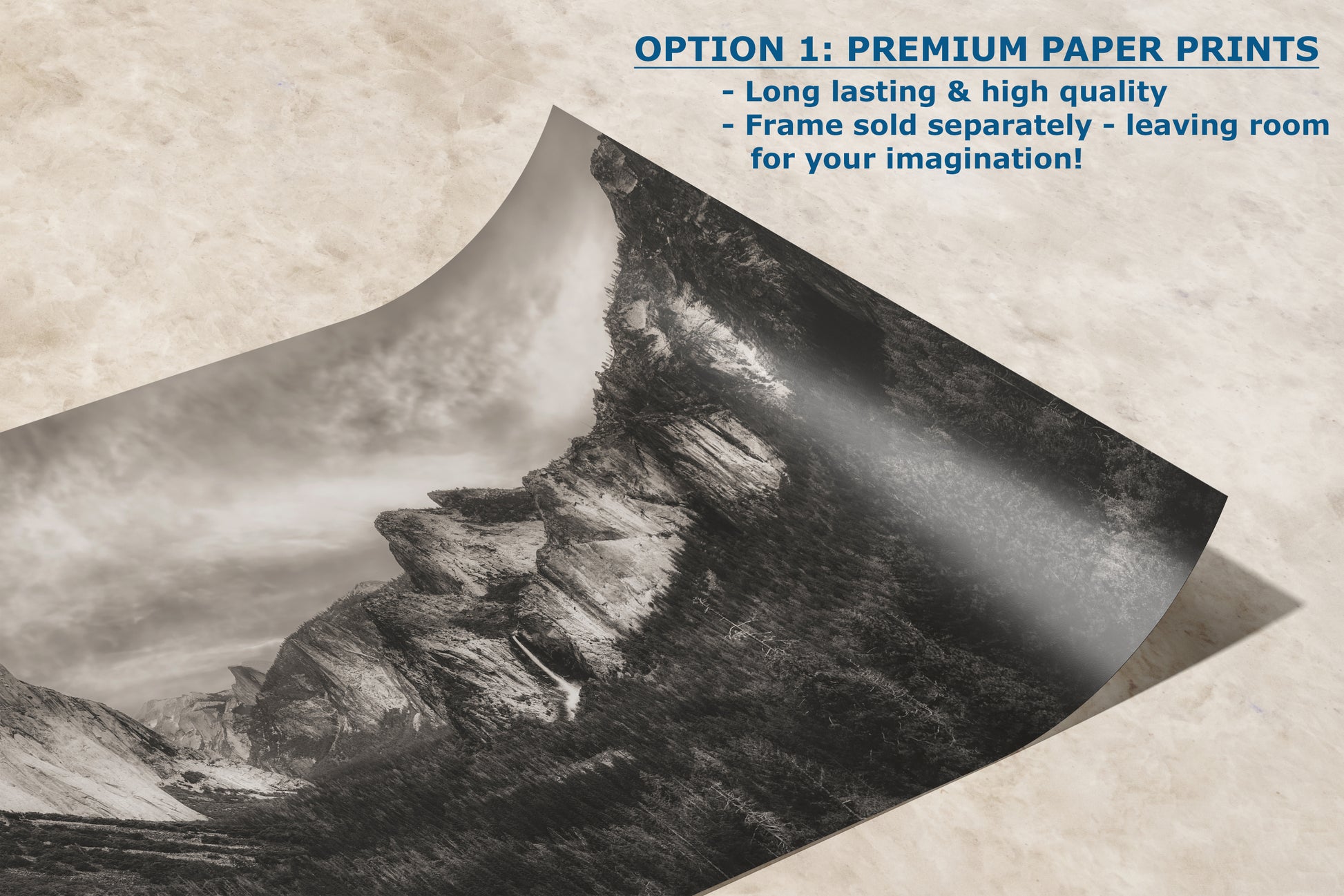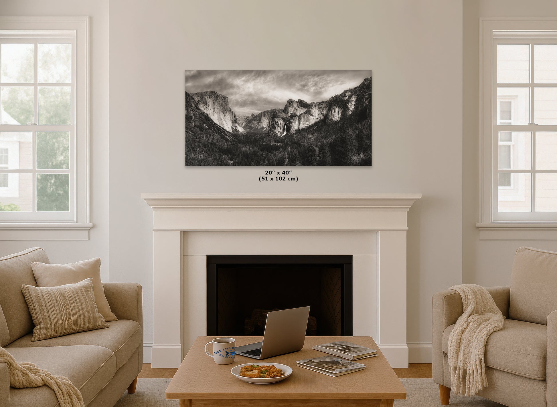 - Iconic Yosemite Landscape: The classic view of Yosemite Valley in black and white emphasizes the depth, texture, and majesty of this famous landscape.