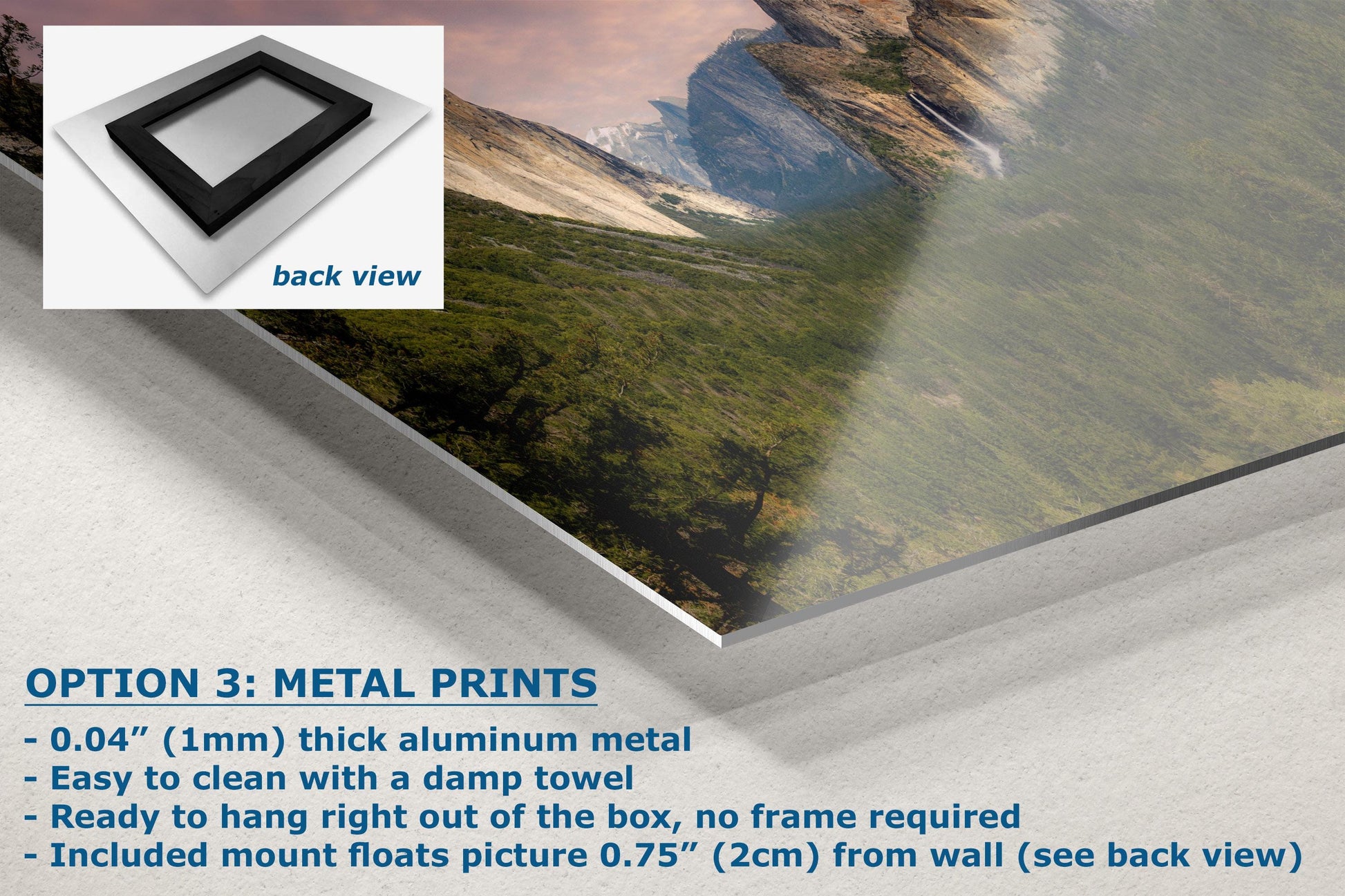 - Floating metal art: 0.04" (1mm) thick specialty coated aluminum metal includes a mount that floats the picture 0.75" (2cm) from your wall