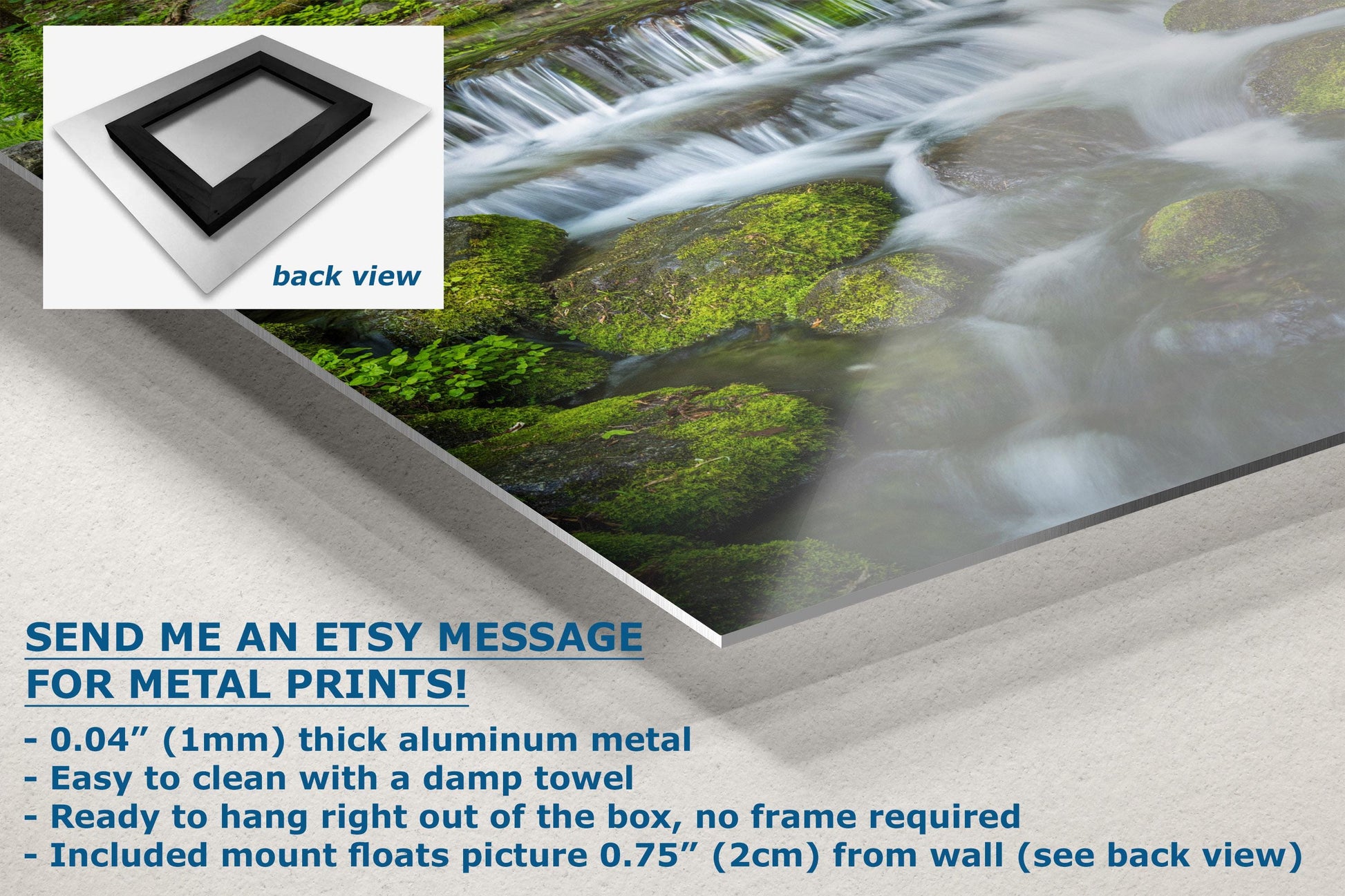 - Floating metal art: 0.04" (1mm) thick specialty coated aluminum metal includes a mount that floats the picture 0.75" (2cm) from your wall
