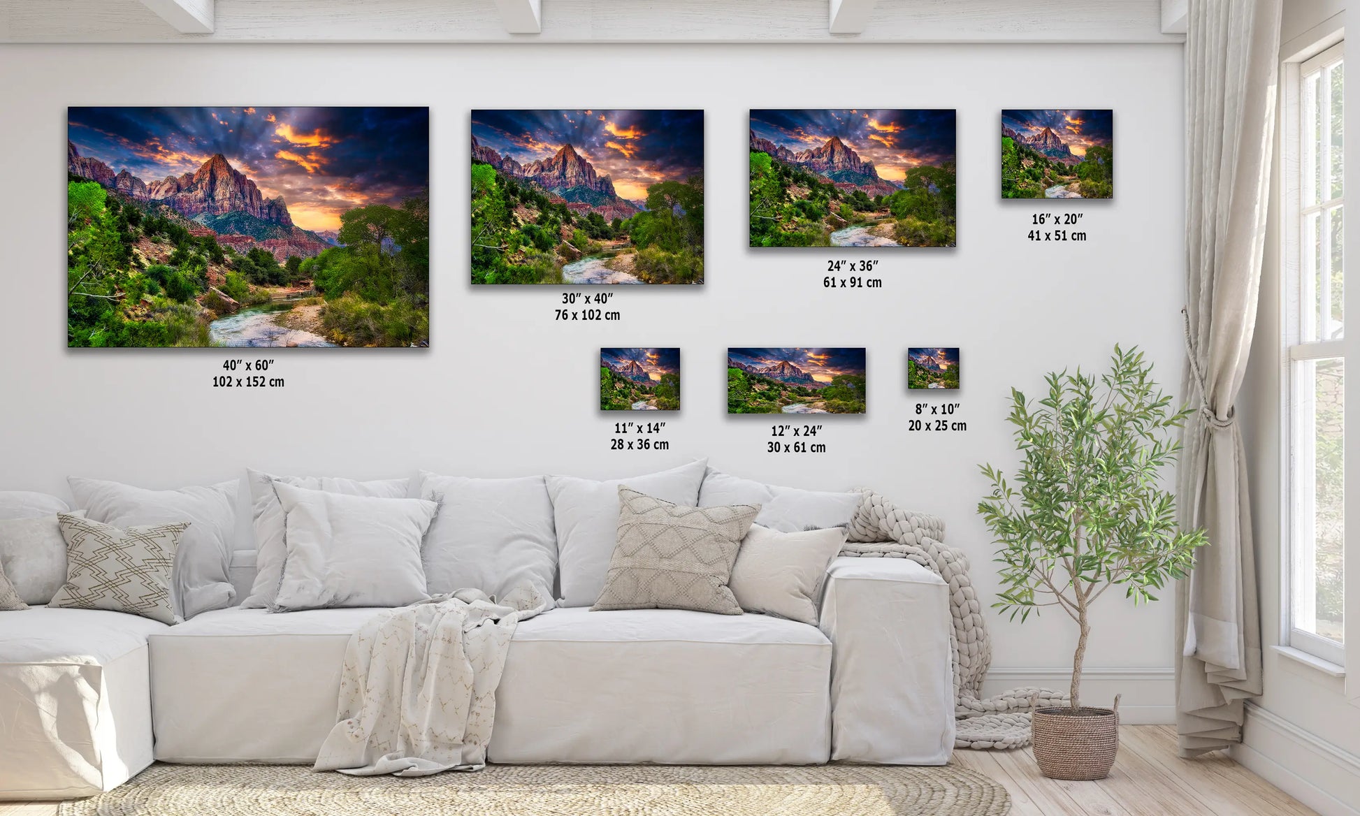 Perfect for adding a touch of nature’s tranquility to your home, office, or creative space, this desert picture features vibrant hues of fiery reds, golden yellows, and calming blues. The meandering blue river through the valley adds a peaceful element, making this Western decor a daily window to the sublime beauty of Zion’s rugged landscape.